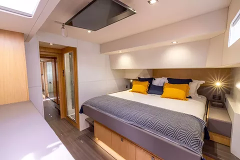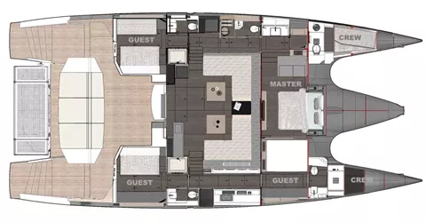 Master centre-line king suite forward and two aft queen berth suites.