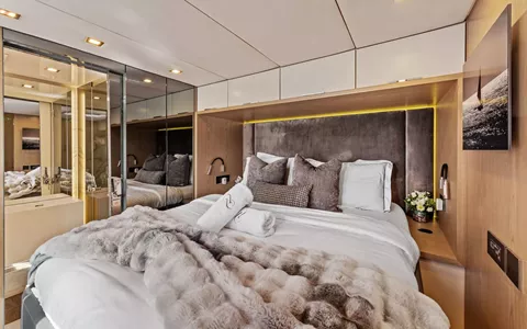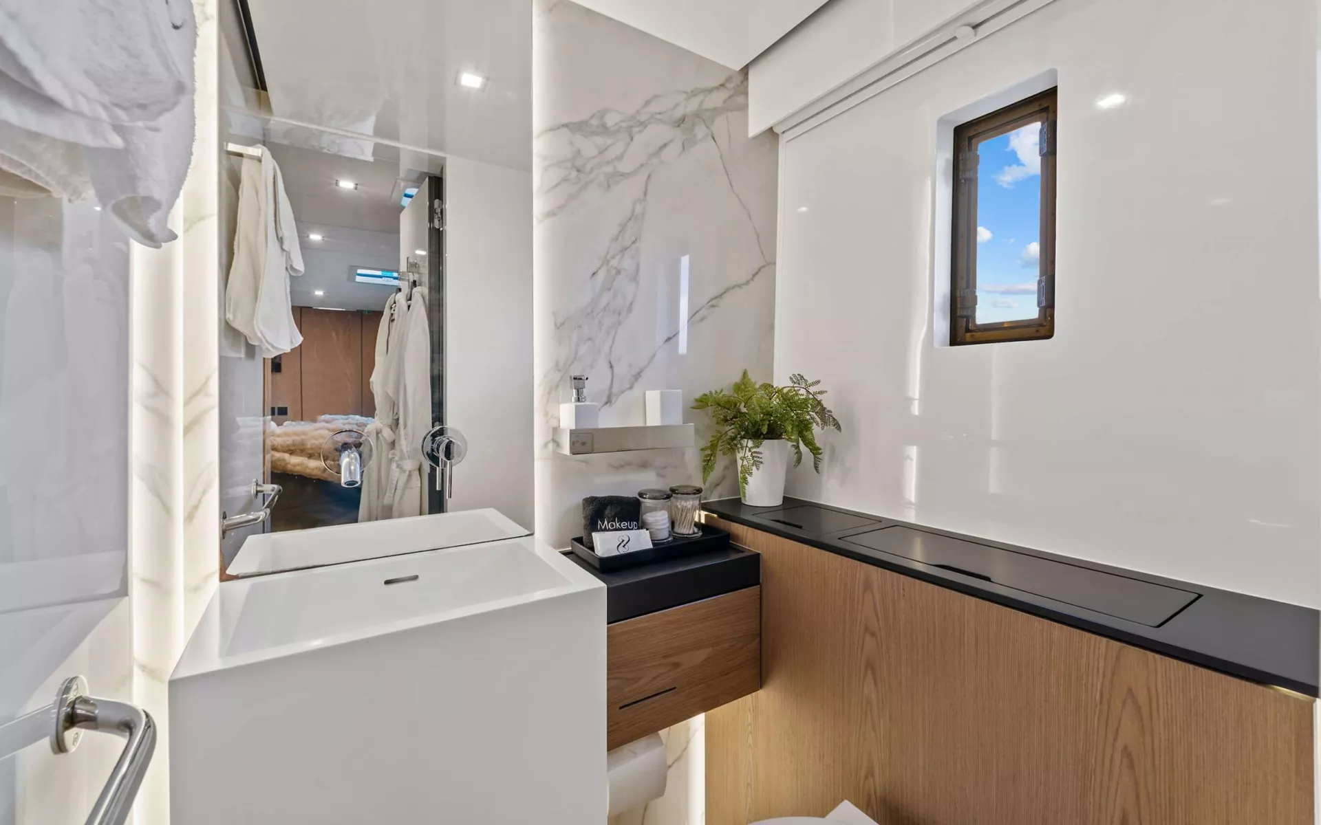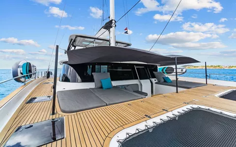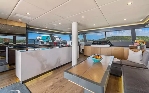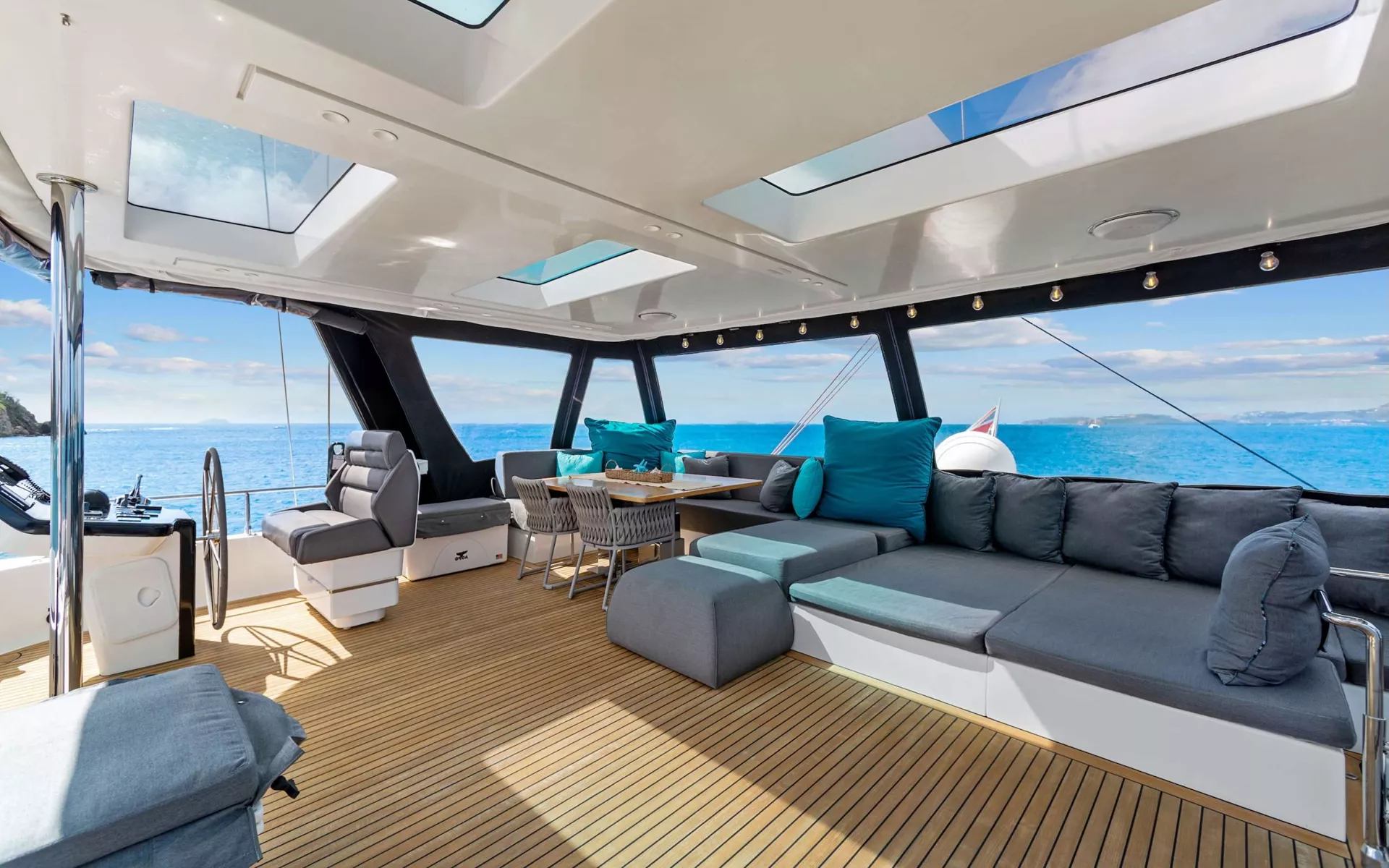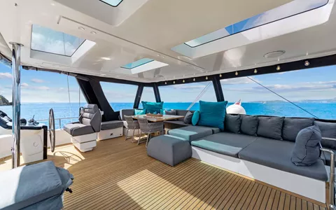This galley up version features a spacious cockpit for dining, which opens onto an expansive aft deck with panoramic views. The foredeck holds additional entertainment spaces with sunken seating, sunpads, and trampolines, easily accessible through the salon or along the outside. The covered flybridge with table provides another generous vista point, and is an ideal place for lounging and enjoying a cooling cocktail.