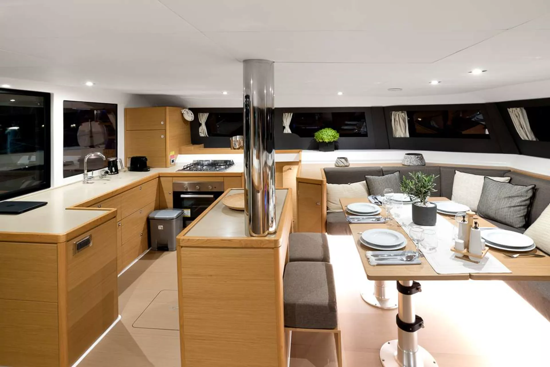 The cockpit area is very spacious, and up to 10 people can be seated easily for breakfast, lunch, or dinner. Or do you prefer an evening dance? The lights will be dimmed, and the party is going to start.