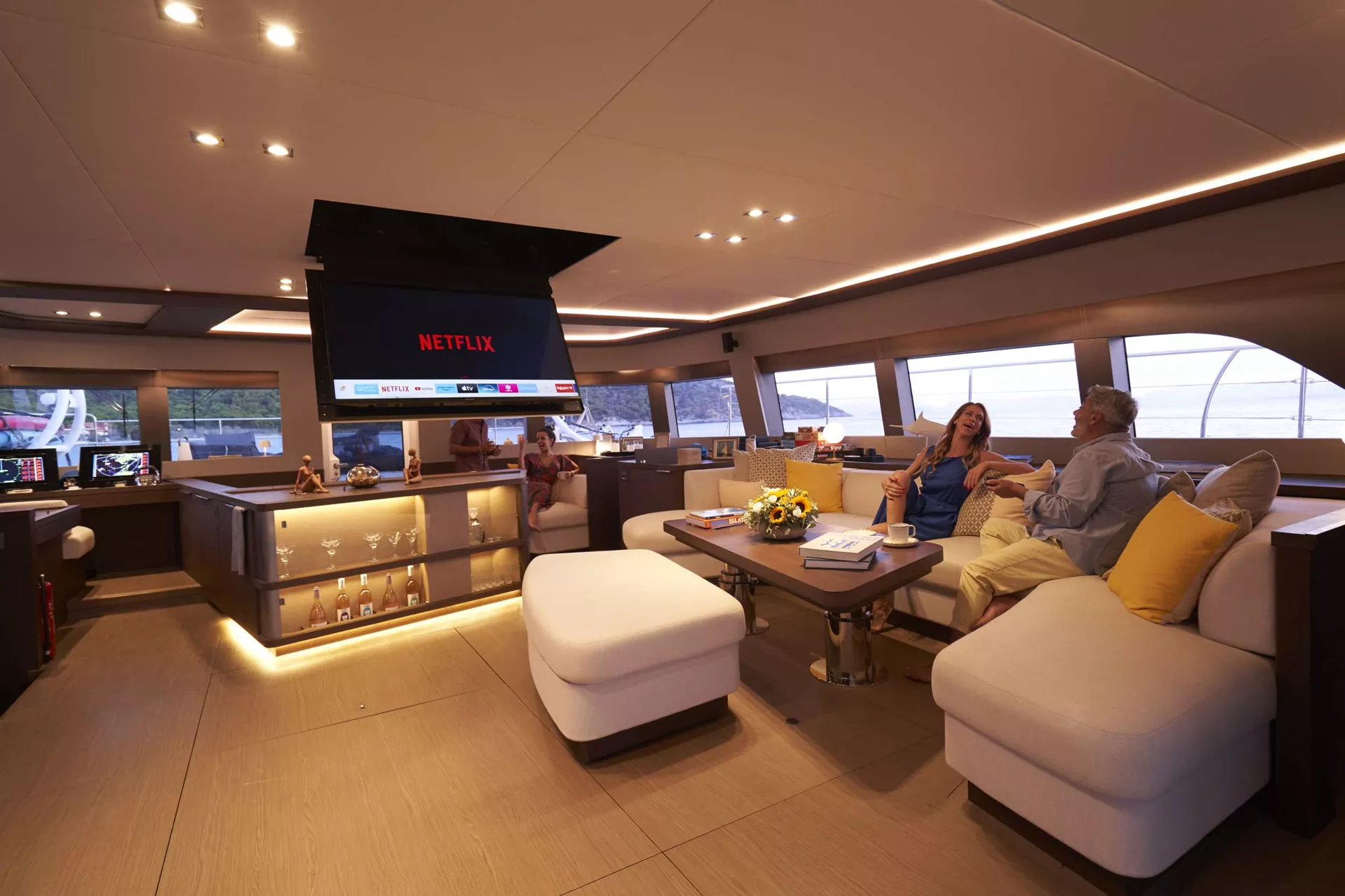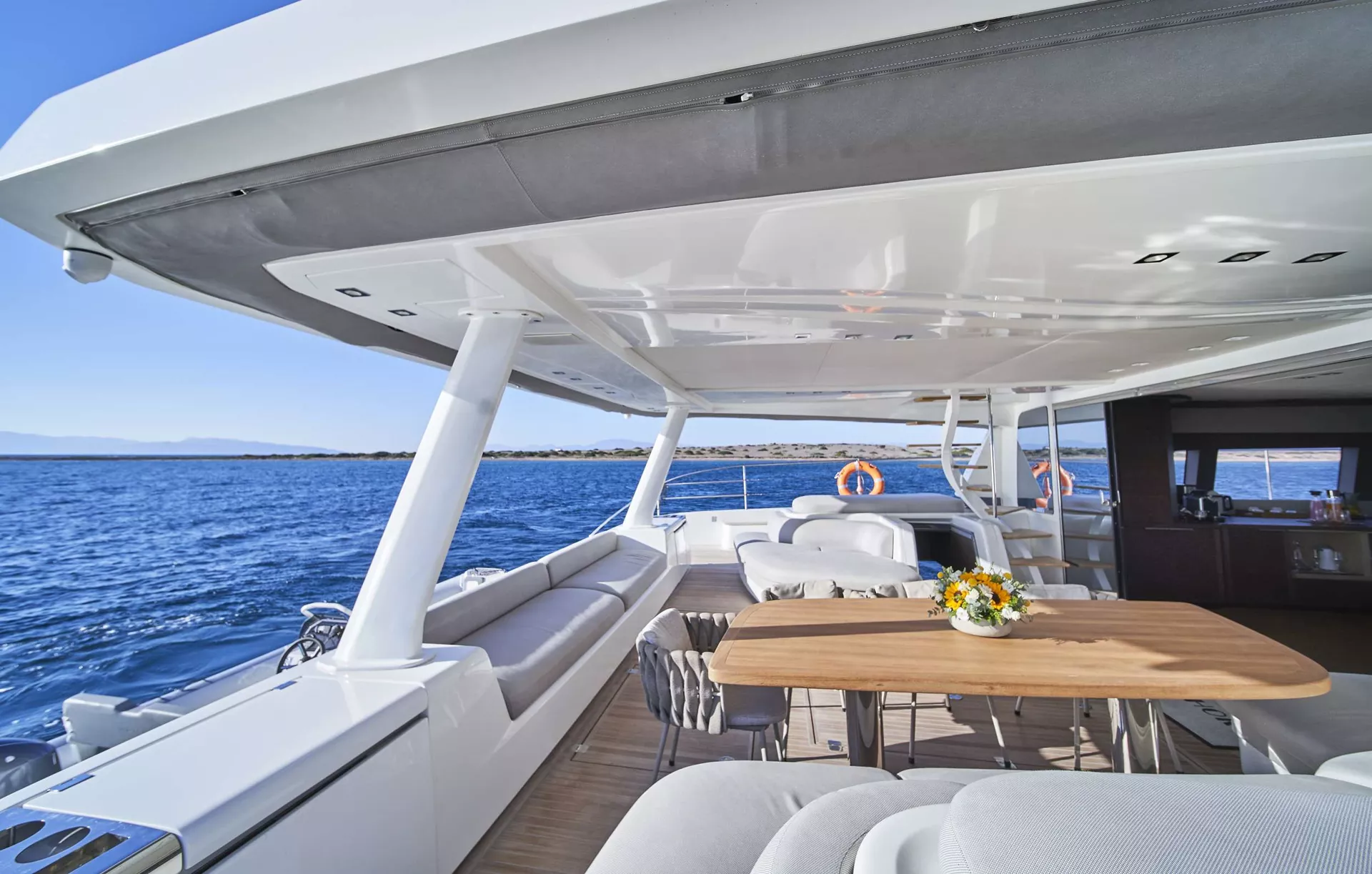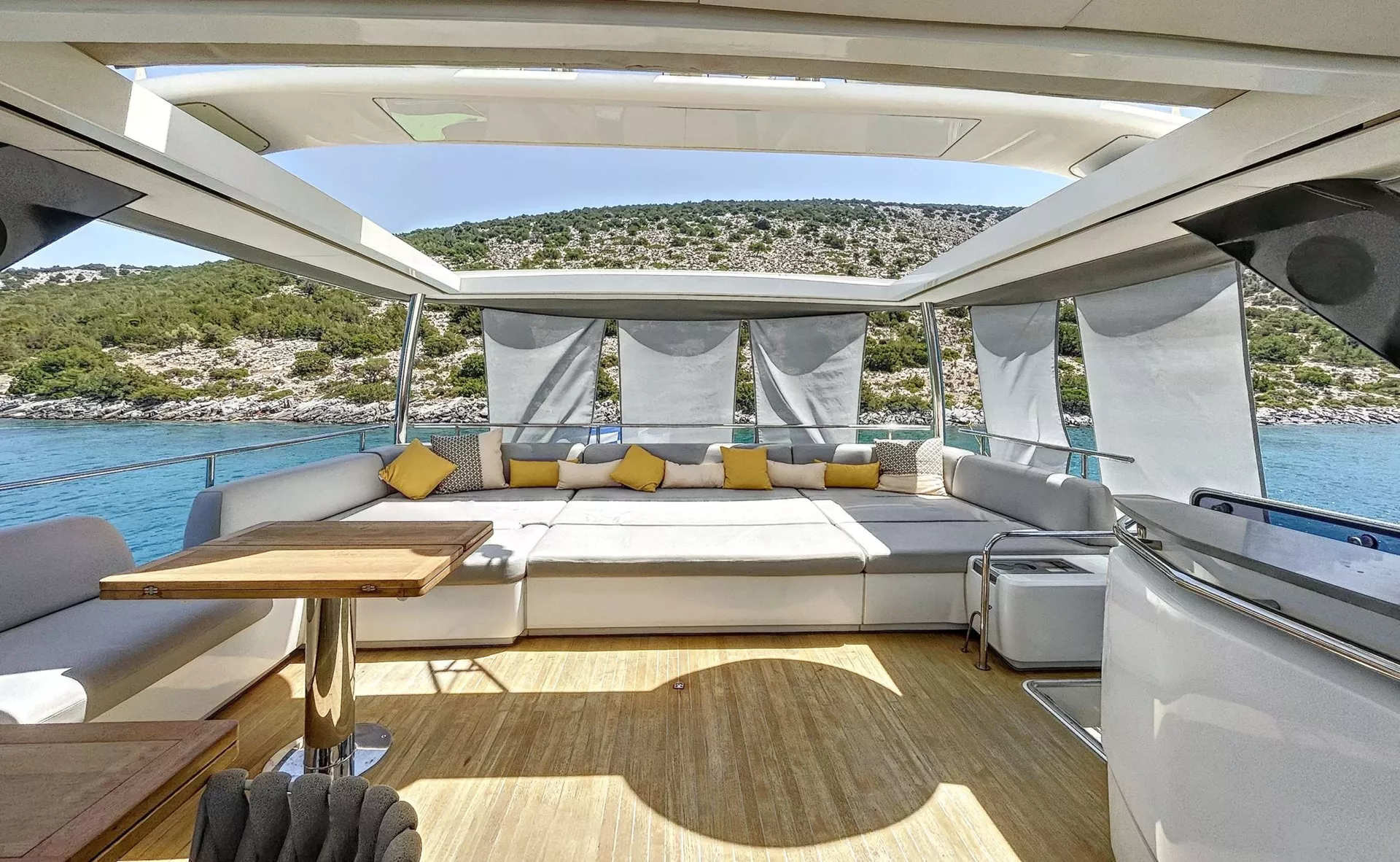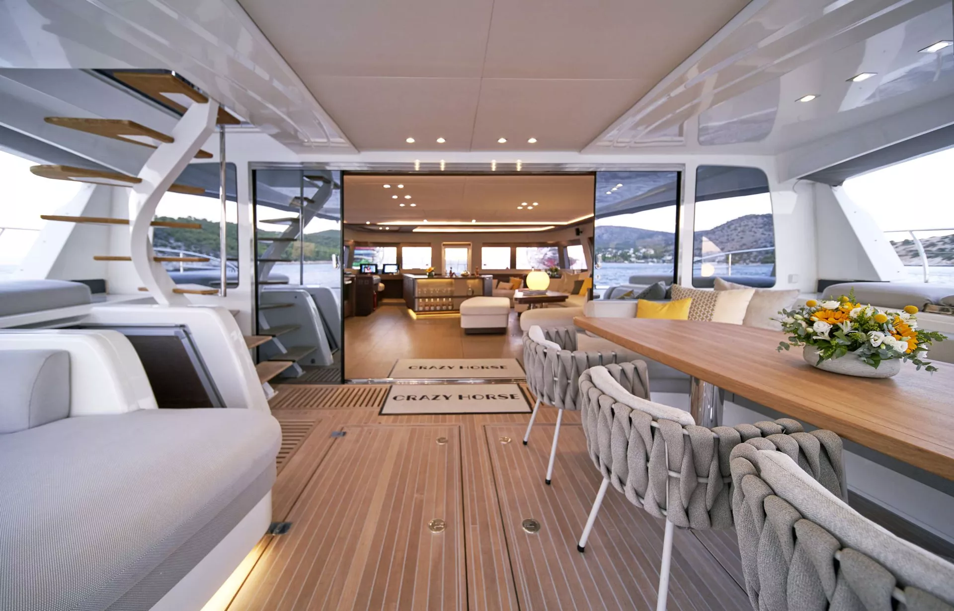 Crazy Horse’s spacious interior includes a stylish main salon featuring a full bar, panoramic windows, and a state-of-the-art entertainment system—the perfect setting for socializing, dining, or simply unwinding. Her generous outdoor areas are designed for pure relaxation. The expansive flybridge offers plush seating, sun-loungers, and breathtaking views—ideal for enjoying the warm Mediterranean breeze. The foredeck lounge is a serene retreat for sunbathing, sunset cocktails, or stargazing long into the night.