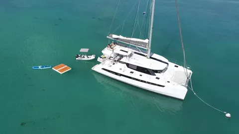 Andiamo is a 50’ sailing cat built for outdoor living: a real flybridge (lounge, table, sun-bed, optional shade/speakers) and a social aft cockpit. She sleeps 6 guests in three en-suite queen cabins (all with bidets) and carries a serious toy locker — E-foil, SeaBob, full wingfoil quiver (4.2/5/6.5), Duotone kite sets 12m/9m (experienced riders only), wakefoil, 2× SUPs, wakeboard, kayak, towables, snorkel & light-tackle fishing — turning every anchorage into a playground.