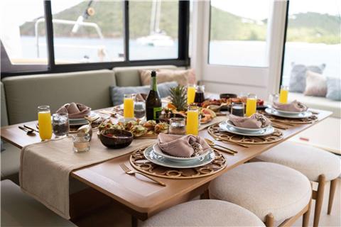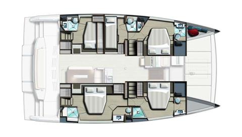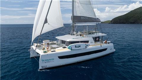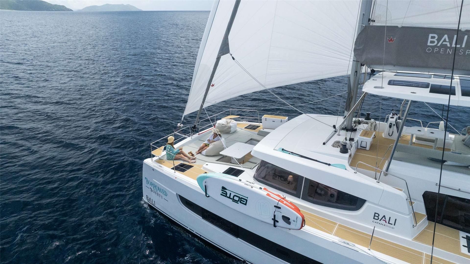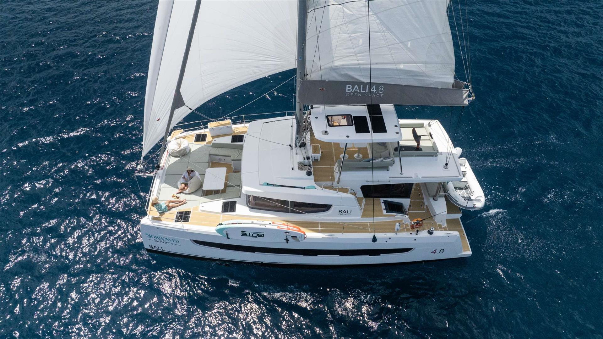 Borrowed Bounty will accommodate 8 charter guests in 4 spacious queen cabins. She is a 2024 sailing catamaran offering SeaDek encompassing the entire deck, upgraded engines, solar panels, air conditioning, water maker, ice maker, full sized refrigerator, a fully customizable menu, ecofriendly and reef safe toiletries, a bar stocked to guest preference, coffee/espresso machine, rendezvous scuba diving, snorkeling gear, underwater scooters, subwing, wakeboard, stand up paddle boards, kayak, towable water tube, floating dock, pool noodles, fishing gear, board and card games, television in the salon, Fusion 3 Bluetooth enabled sound system and Borrowed Bounty giveaways.