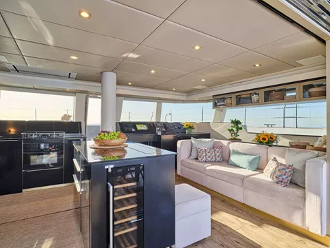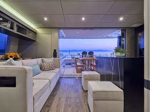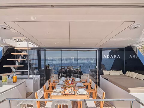 Stretching 50 feet in length, ADARA is thoughtfully designed to feel open, bright, and wonderfully inviting. She features four spacious cabins, each with private ensuite facilities, offering the perfect balance of comfort and privacy for up to eight guests. Inside, her modern interior is elegantly finished with soft tones, premium materials, and large panoramic windows that flood the space with natural light. A state-of-the-art entertainment system, chic salon, and thoughtfully designed layout create a relaxed, upscale atmosphere that feels like a floating boutique hotel.