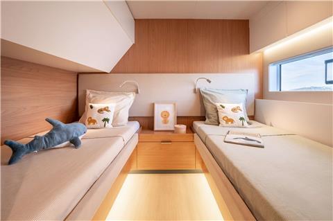 1 front peak + WC, 1 twin central starboard cabin + ensuite WC