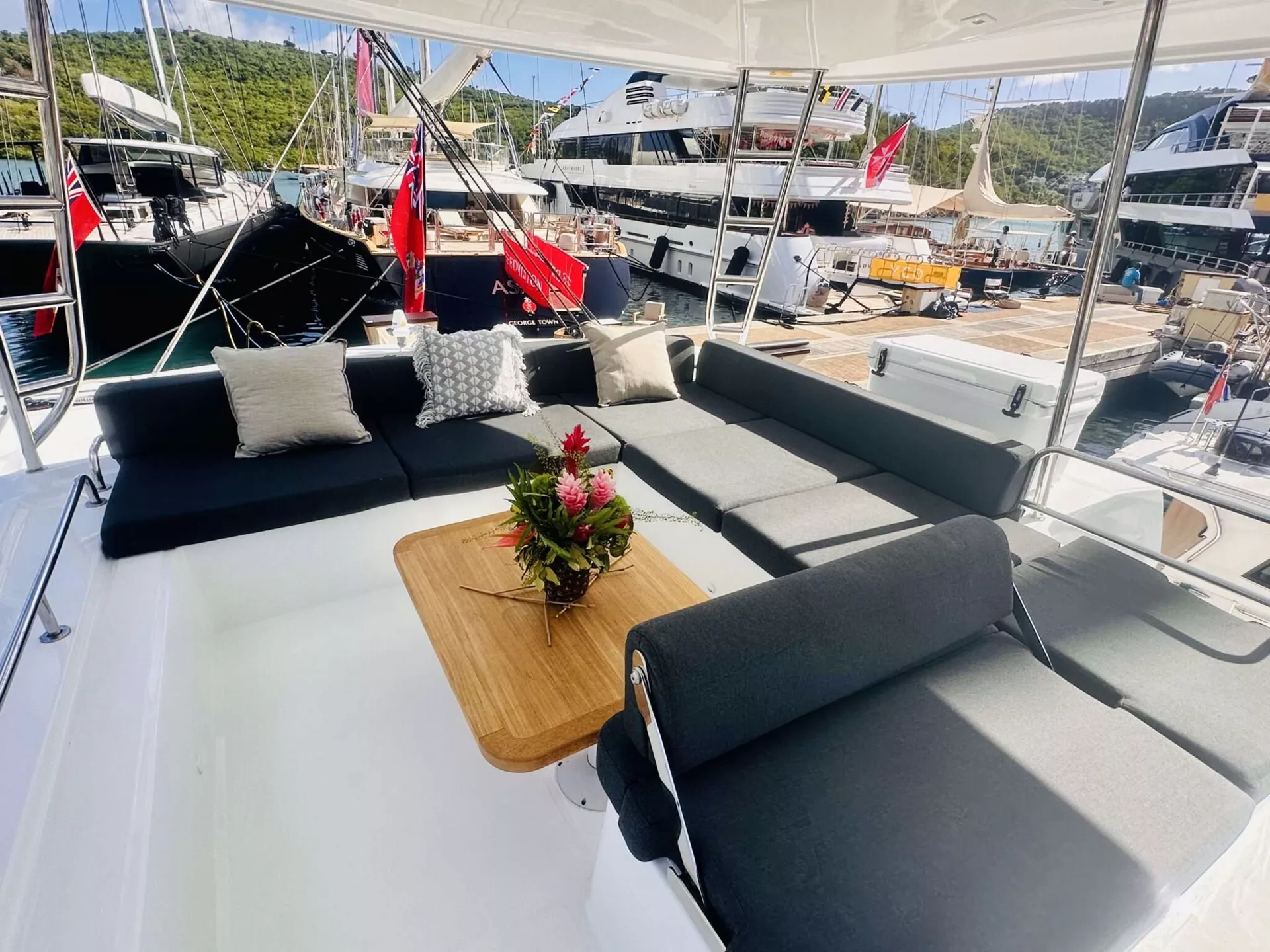 The Flybridge, featuring a full bar and additional dining area, offers an elevated, spacious, and luxurious venue for socializing and dining. Enjoy breathtaking panoramic views and enhance your sailing experience in refined elegance.
