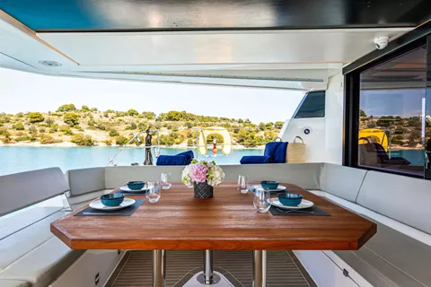 Features include expansive outdoor spaces, a flybridge with panoramic views, and a well-appointed interior for