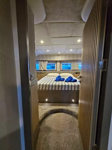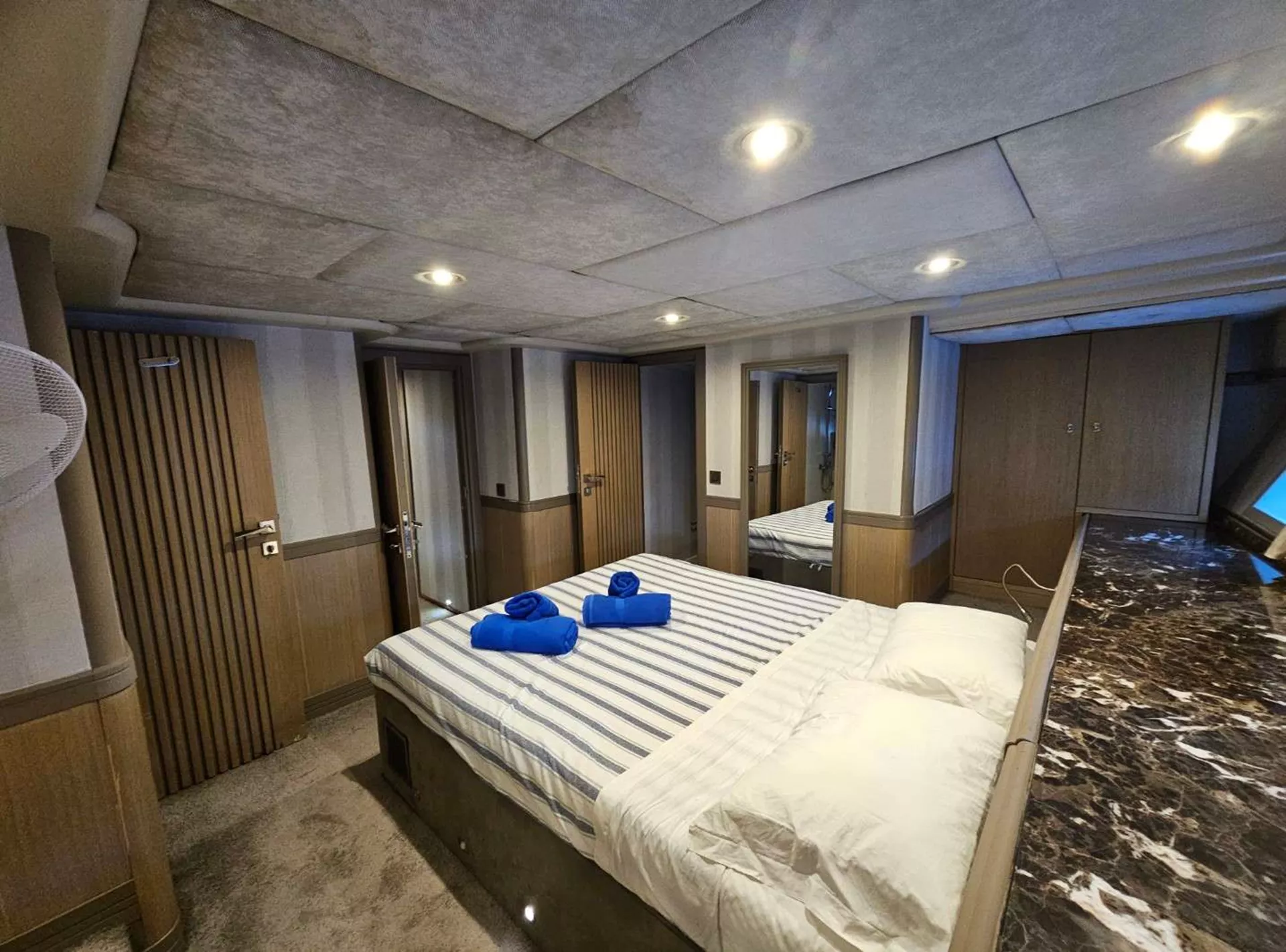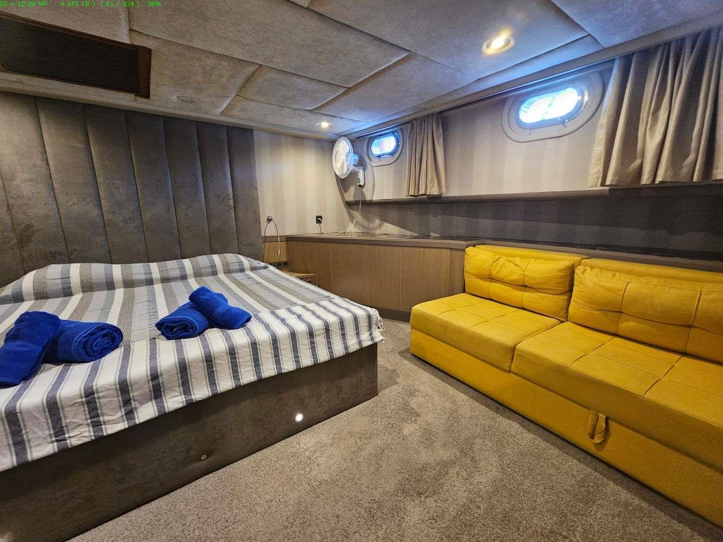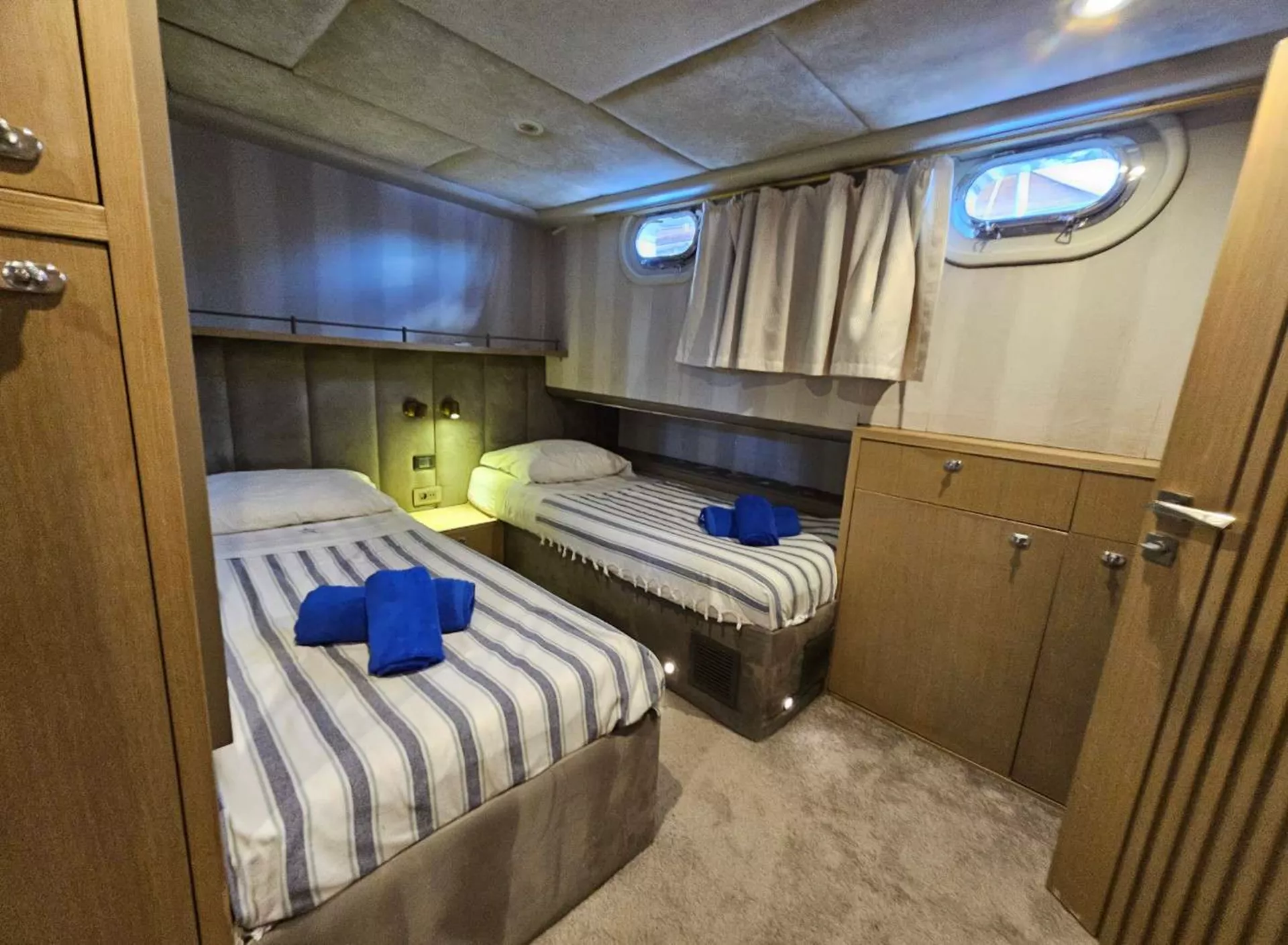 Bed configuration: Aft master cabin: double: 200 x 200 (+ 1 extra bed 185 x 80 if needed), 2 x aft double cabins: 190 x 160, Bow master cabin: 200 x 182, Bow twin cabin: 190 x 85.