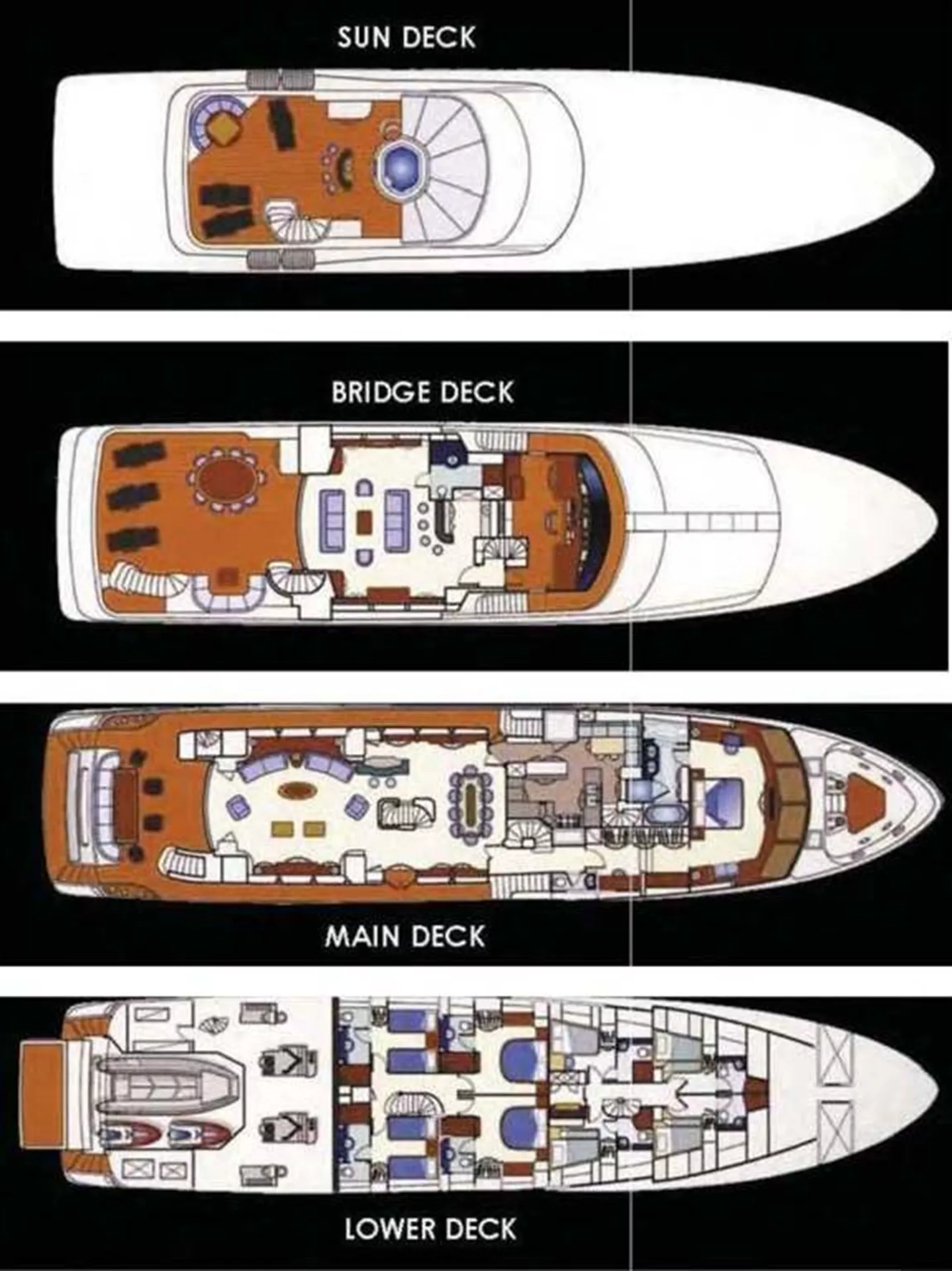 • Saloon, Sky lounge and Master Cabin: VHS, DVD, CD, 200 DVD video on demand); 40 inch plasma TV; Satellite TV (sky); Ipod docking station.