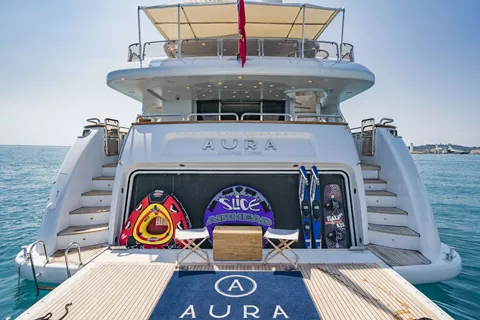 For those who prefer to be outside, AURA offers ultimate luxury in cool comfort with al fresco dining, deck Jacuzzi and an array of exciting water toys for the more adventurous charterer!