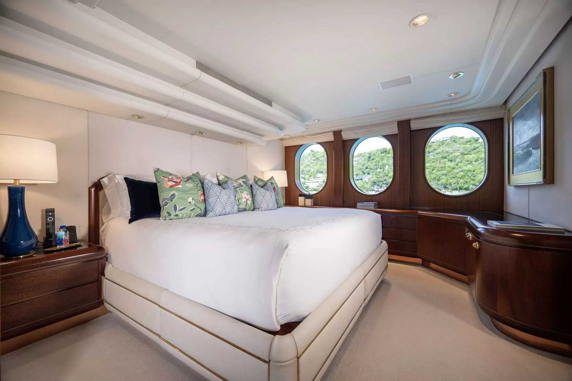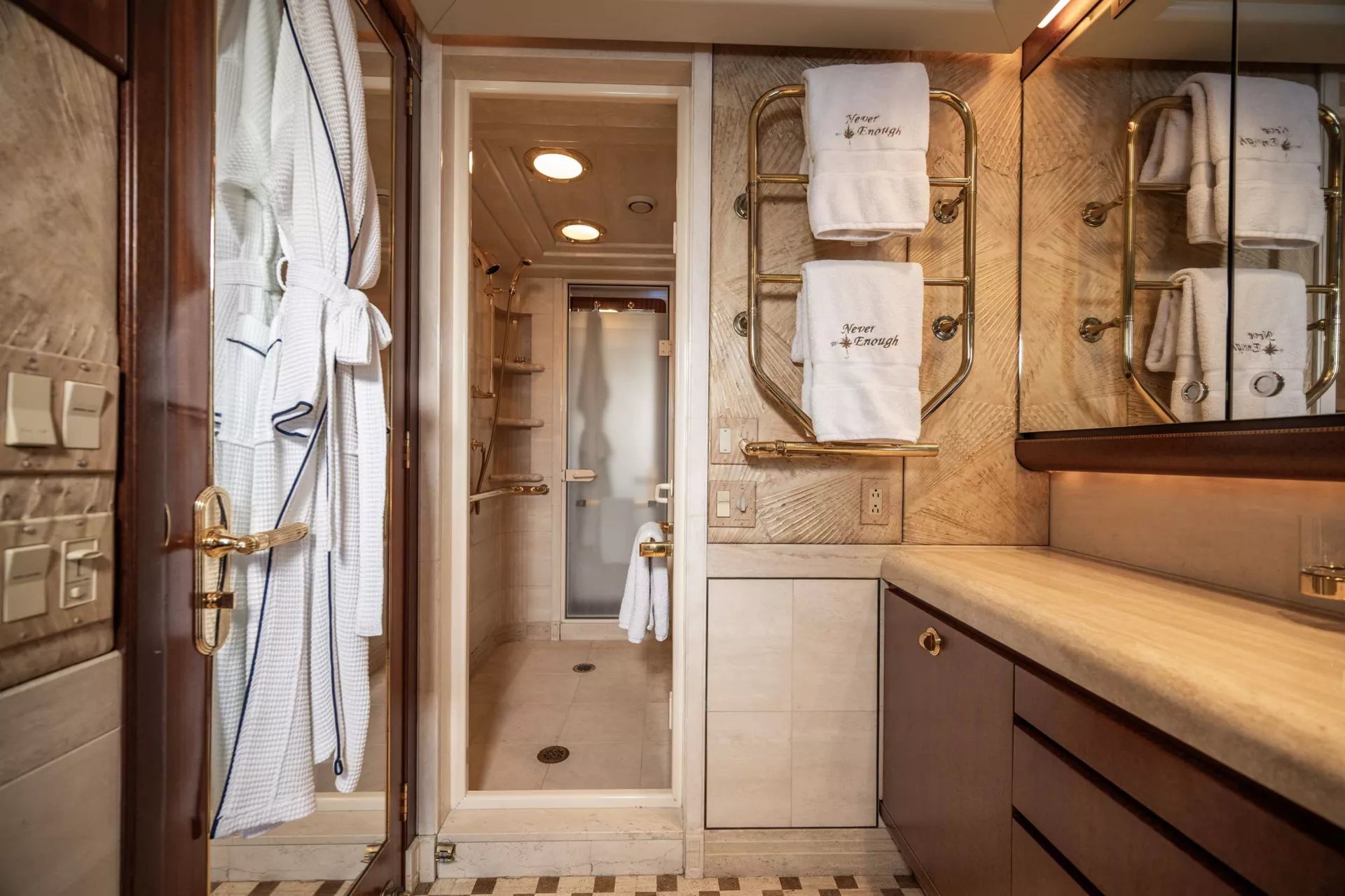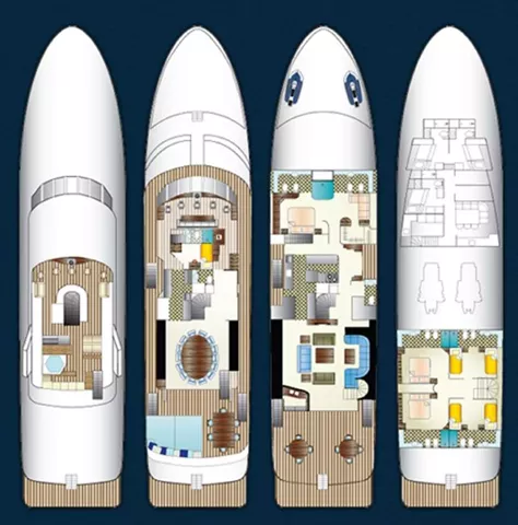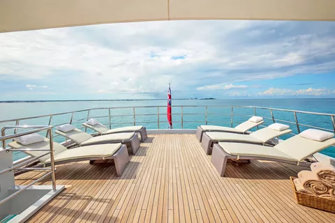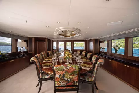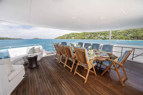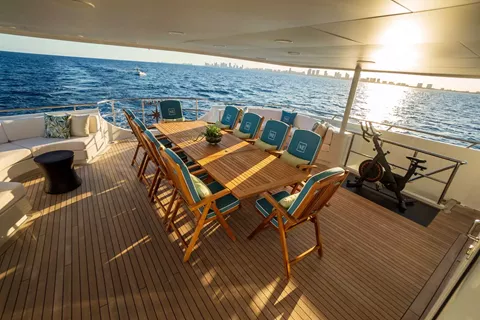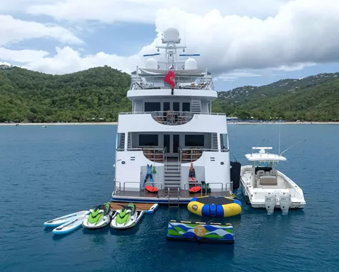 140’ Motor Yacht NEVER ENOUGH is better than ever.She has completed an extensive refit which includes new engines, decks, beds, soft goods and many other thoughtful details to enhance guest comfort, NEVER ENOUGH accommodates ten guests in five staterooms: an on-deck King Master, two queens and two twins. The entire yacht sparkles and has new soft furnishings throughout. A large swim platform provides easy access to water fun. Water toys include a new 32 Ft. Boston Whaler and two new three-person Waverunners. NEVER ENOUGH shows like a brand new Feadship.