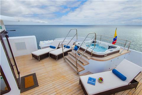 Elegant and comfortable, the Natural Paradise is the newest yacht in Galapagos. Four of her nine cabins feature private balconies and the main deck suite offers an ample relaxing space. Her social areas include a beautiful teak sundeck with Jacuzzi and a cozy al fresco dining. On the main deck you will find a spacious lounge and dining room. Snorkelling equipment, wetsuits and sea kayaks are available on board.