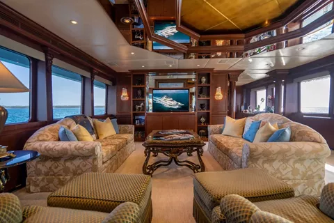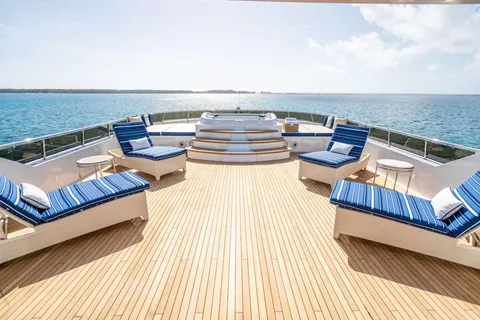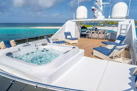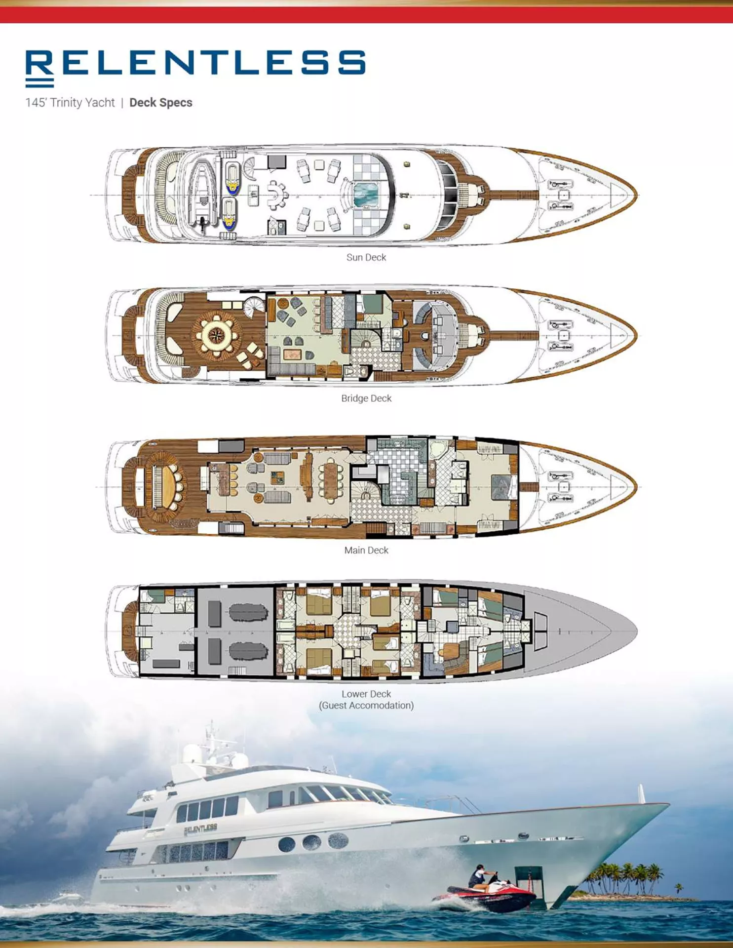 Elegance meets power with this solid and artfully constructed 145′ Trinity Yacht. After chartering her for five years, the current owners purchased Relentless in late 2018 and have enjoyed upgrading and refitting her. Come relax in the impeccable craftsmanship of her exquisitely designed, soft beige and gold-accented interiors. Opulent dining, spacious interiors, and panoramic views will take your breath away… pampering awaits. Her main salon includes a sit-down bar aft, salon area with entertainment and a separate private formal dining room where the chef’s culinary creations are waiting to delight. Relentless features five lavish staterooms including a king master suite located on deck with his and hers bathroom to include a large shower and Jacuzzi tub. Four additional guest staterooms are located below, which include two king staterooms, one queen and one twin, all with en-suite bathrooms, full entertainment systems and large closets for storage. The sky lounge offers a comfortable gathering area to watch movies, enjoy afternoon treats from the chef and is a popular guest area. Step outside to experience our three spacious decks and submerge yourself in 360 degrees of breathtaking vistas. All decks feature ample seating, tables and chairs for socializing and dining. The spacious sky lounge deck features a large round table where many theme parties are held. The crew of Relentless have a huge assortment of fun filled themes from fun to formal and anything in between. If you’re feeling invigorated, Relentless offers a treadmill and full assortment of gym equipment for outdoor exercise on the newly refit flybridge. The flybridge was reconfigured with a new Jacuzzi, wraparound sun beds, lounging furniture and new sit-down bar as well as a movie night option under the stars. Relentless offers a full list of water toys for your fun and adventure and has a proven charter crew of 9.