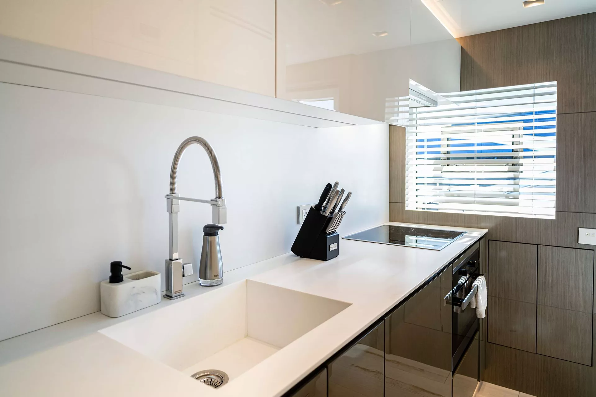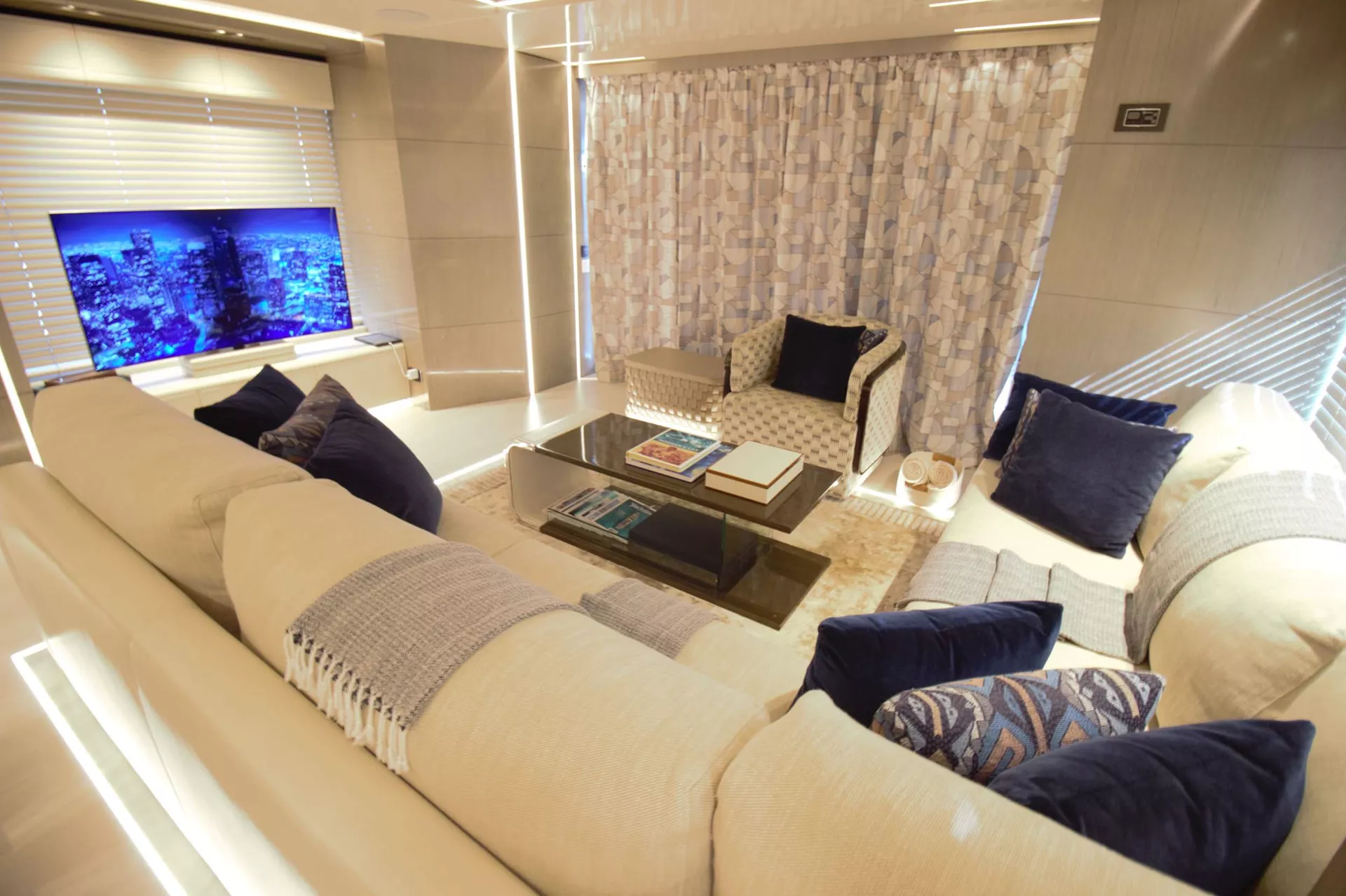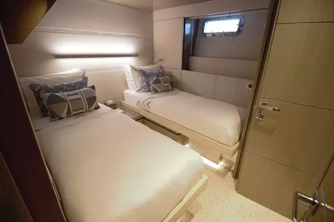 Master King on the main deck, VIP Queen below, plus one Full on Port side which can convert to twins, and then twin beds in the Starboard cabin.