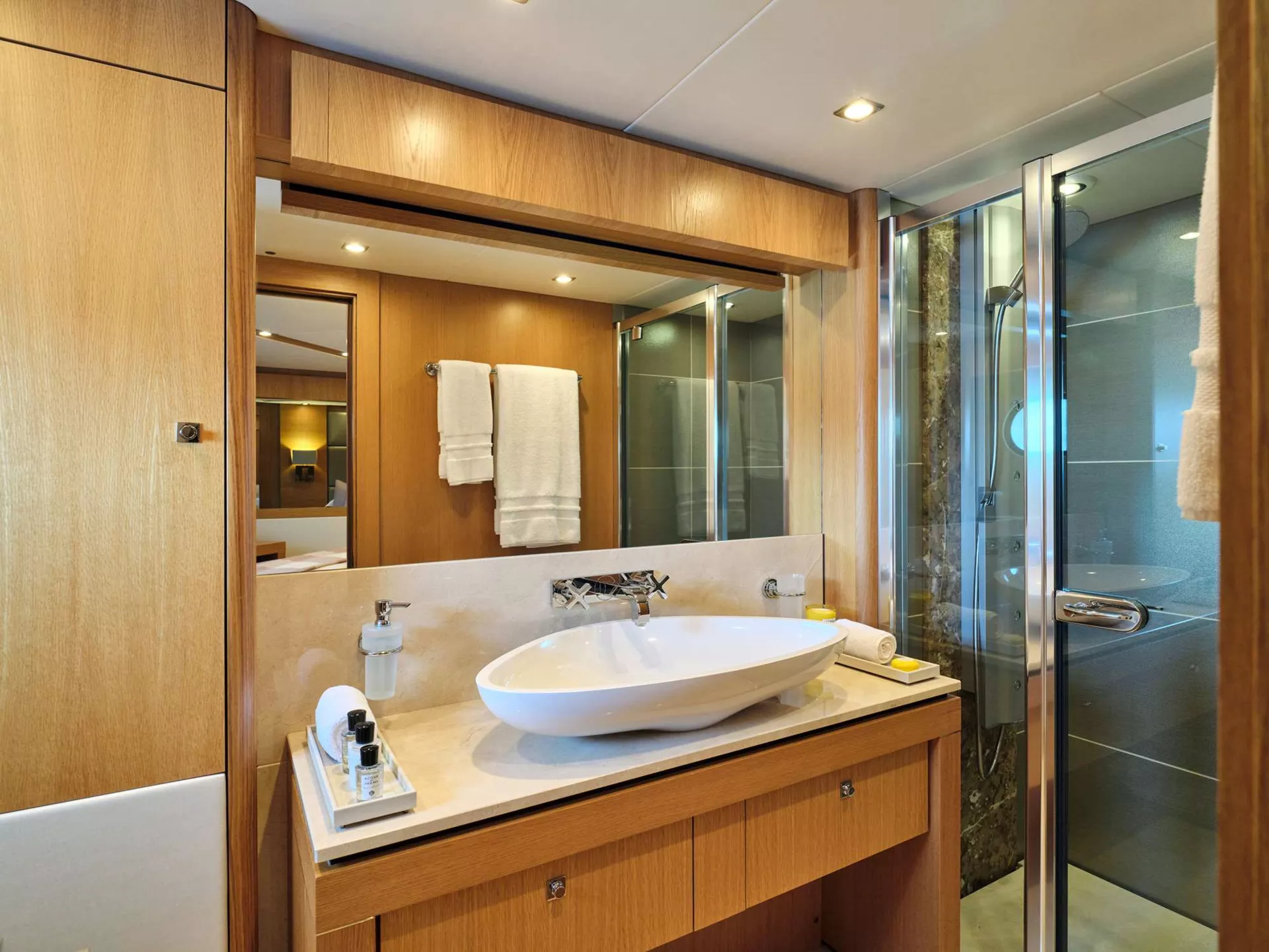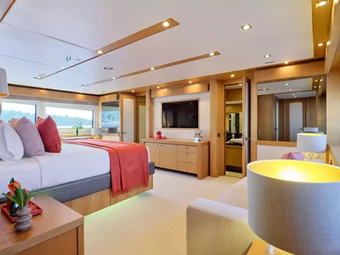 Master Cabin on Main Deck with with king size bed dual-entry en-suite facilities in marble. Two sinks, shower and walk-in closet in bathroom. Second Walk-in closet, safe, desk, sofa and TV in cabin.
