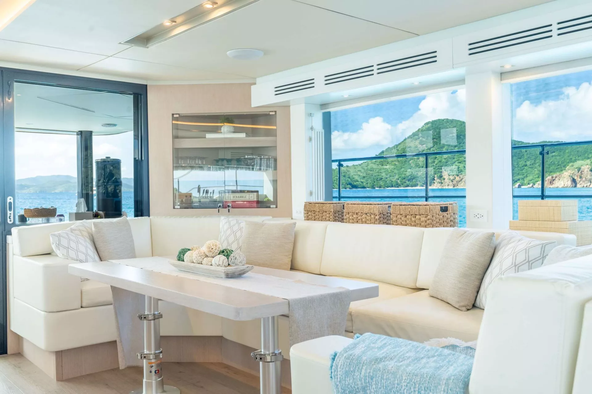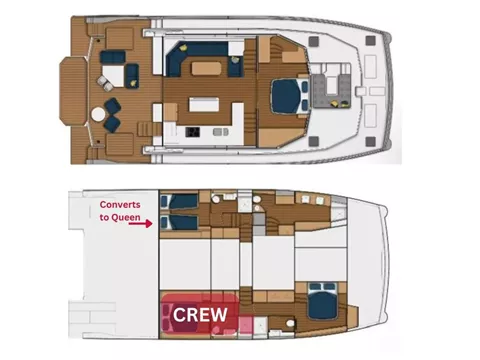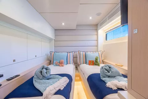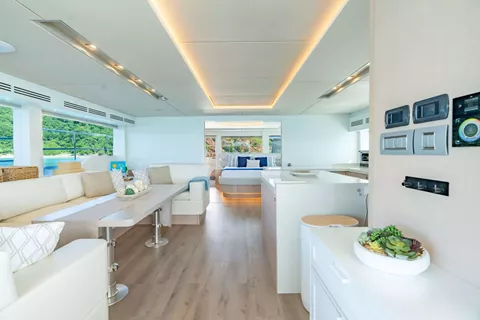 A favorite feature of 'Forever Young's' layout, is the on-deck primary cabin with a walk-around King-sized bed. The master has 180-degree visibility out of 27” high windows, for a panoramic view of the BVI! The ensuite head is in the port hull, and has twin sinks and a large 3’ x 4’ separate shower. There is a generous VIP cabin with Queen sized bed starboard and on the port side is a guest cabin that can be configured with two Twin beds or one Queen, based on guests' preferences.