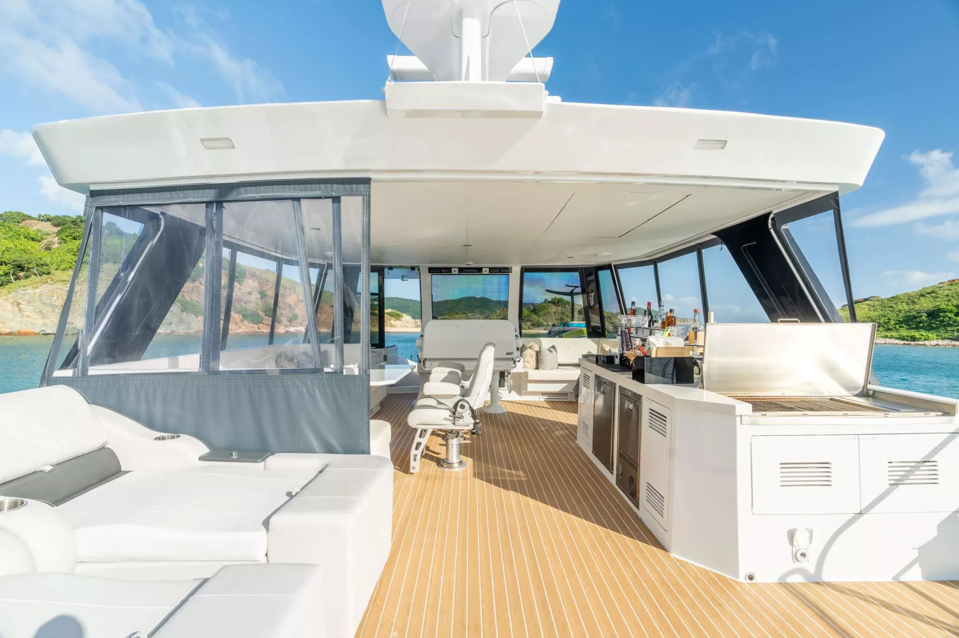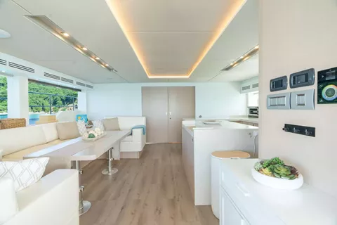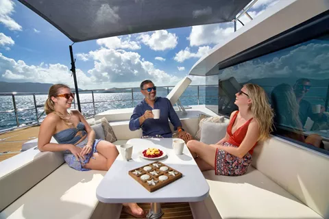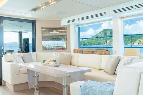 There are multiple outdoor seating areas for guests to enjoy; a large aft dining table - perfect for al fresco dinners, a huge covered flybridge with dining and relaxation areas as well as built-in sun loungers.