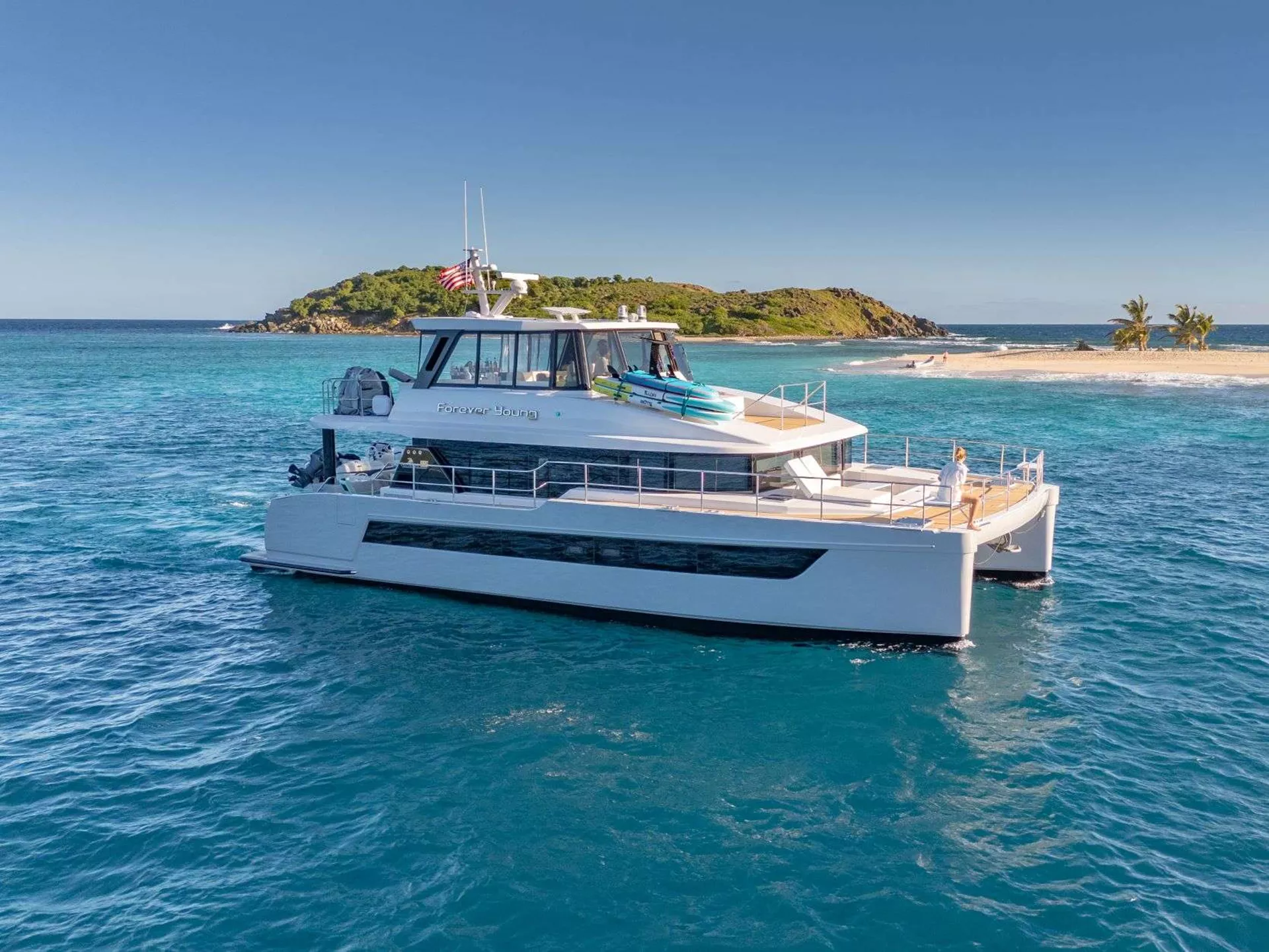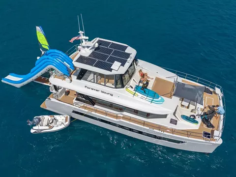 'Forever Young' looks forward to welcome guests aboard this stunning powercat for an unparalleled charter experience, blending luxury with adventure in the BVI!