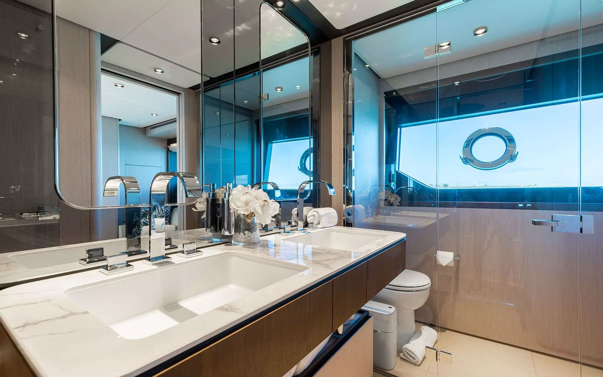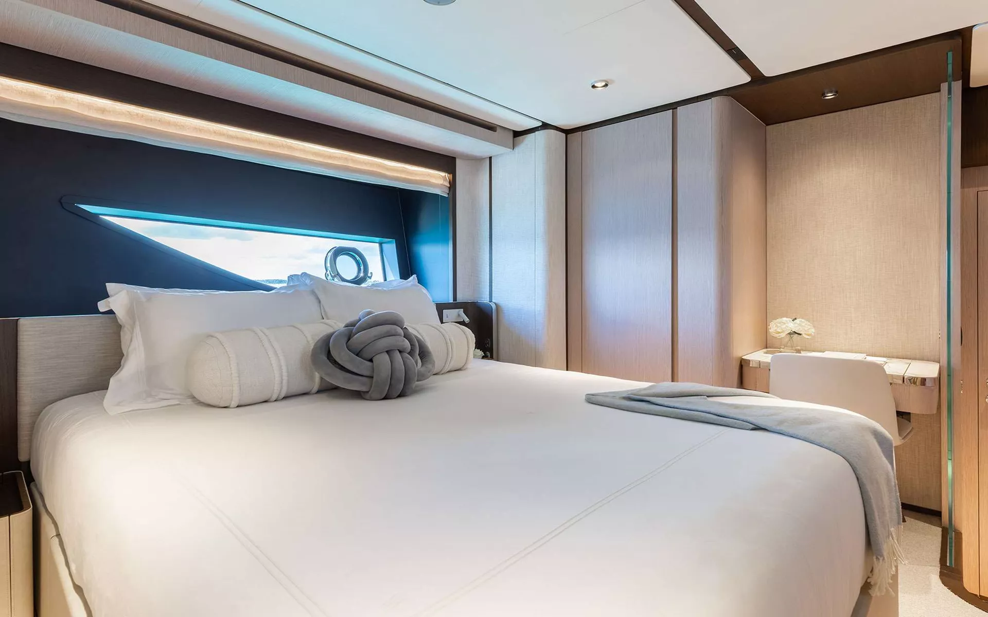 A well insulated Master stateroom with King size bed, walk in wardrobe and ensuite with double sinks/ shower impresses for this size.