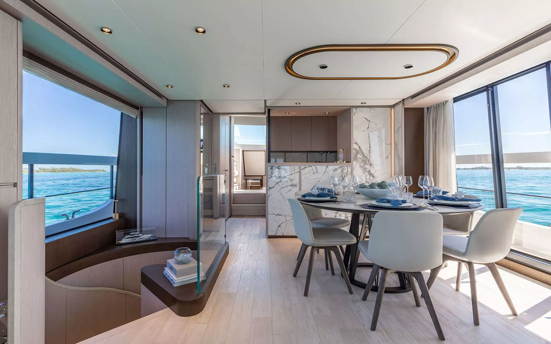 Amid ship an easy escalating set of stairs brings guests to the 4 staterooms below.