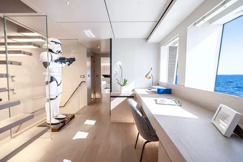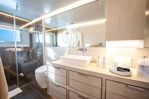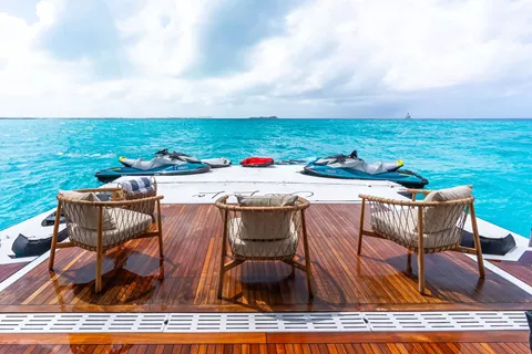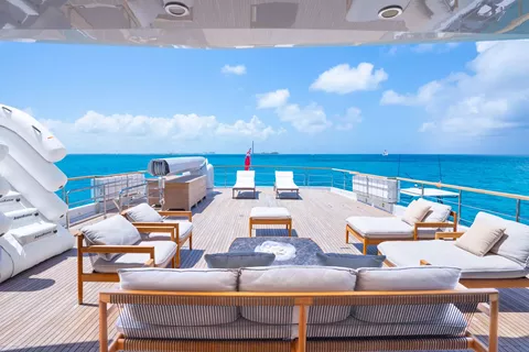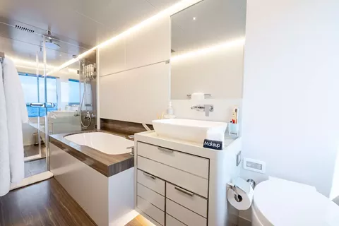 Onboard, guests can enjoy a variety of amenities designed for relaxation and entertainment. Unwind in the beach club, soak in the deck jacuzzi, or host an intimate gathering in the main salon, complete with a 100-inch Smart TV. The sky lounge boasts a fully stocked bar, a lounge area, and office space for added convenience. Equipped with high-speed Wi-Fi and air conditioning throughout, EAU LA LA ensures a seamless and comfortable stay.