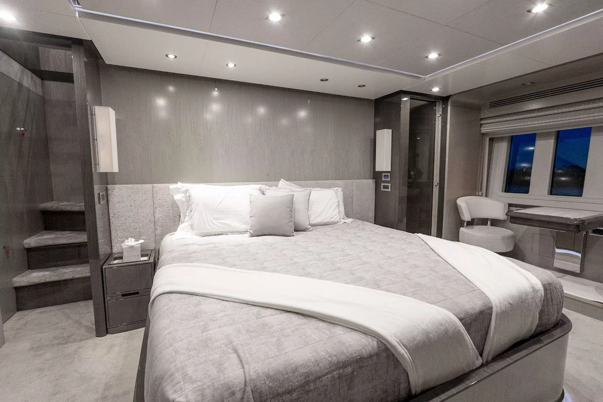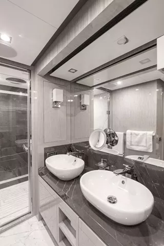 4 staterooms all with private bathroom/shower. Master has king, then there is a queen, a double, and side by side