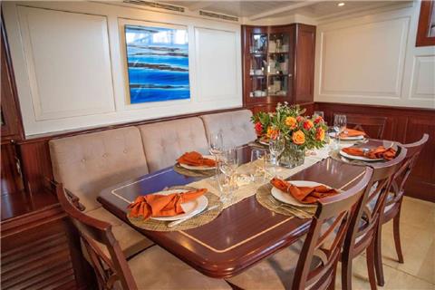 With her open-plan accommodation, AURELIUS becomes a real home away from home. Offering an overall theme of subtle Honduras mahogany and cream paneling with chestnut flooring, she evokes elegance and style whilst allowing an informal atmosphere.