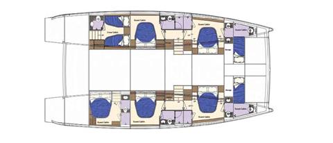 5 queen cabins with en suite bathrooms for guests. 2 additional single forepeaks with own bathroom for guests. The crew uses the aft cabin with 2 separate twin beds. All main interior cabins have electric freshwater flush toilets and US electrical outlets.