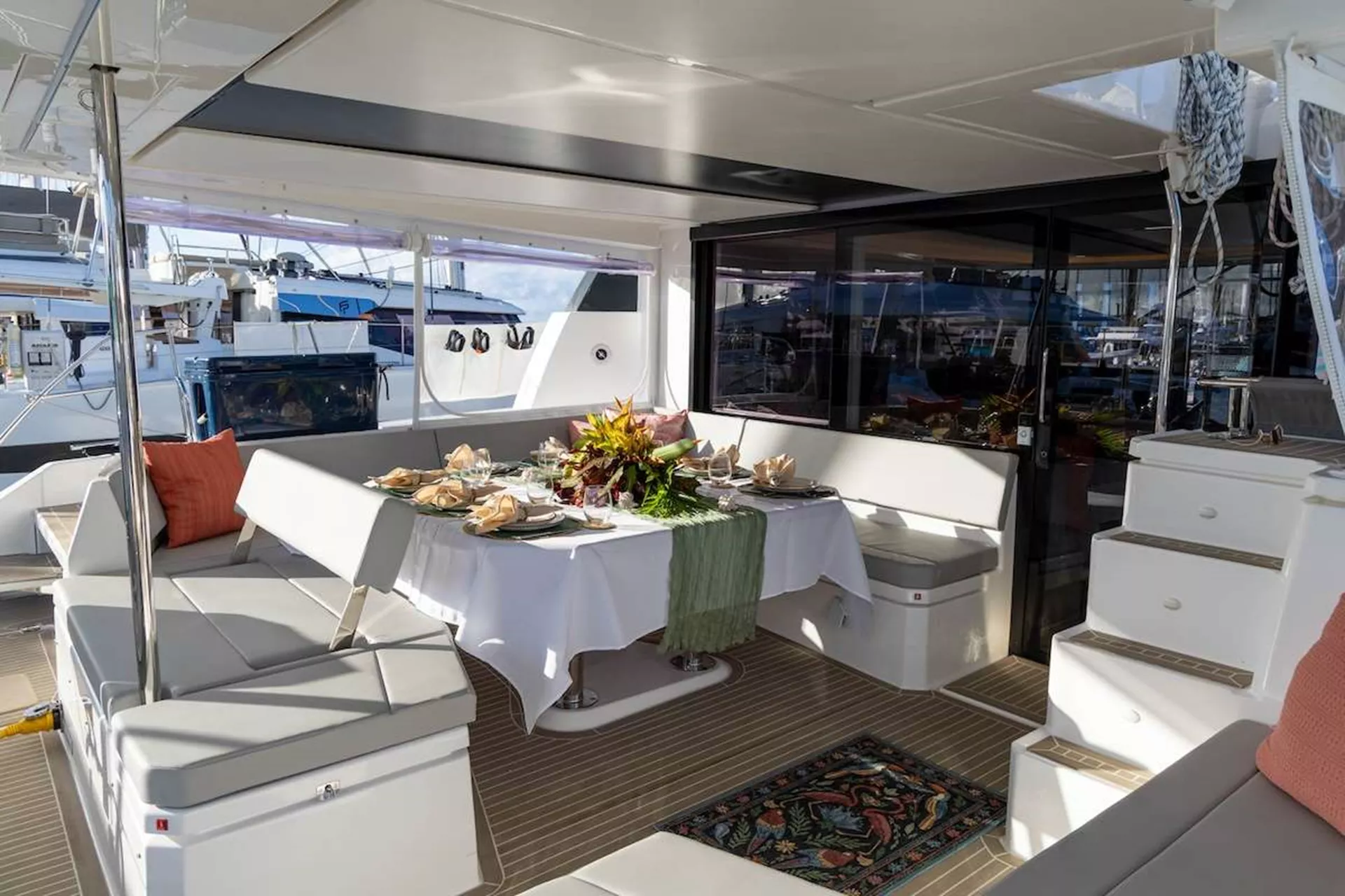 Below deck, four beautifully styled queen cabins await, each with a private en-suite, ensuring every guest enjoys their own serene retreat. From your morning coffee to evening sundowners, this yacht places you front and center in the heart of paradise.