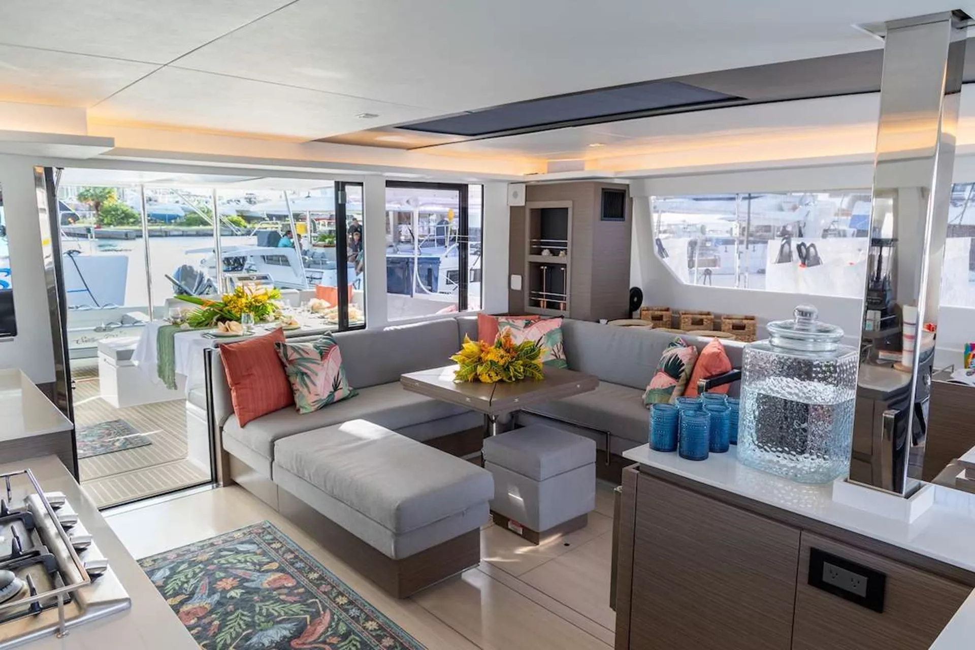 Crafted for those who value both luxury and the freedom of the sea, this yacht invites the outdoors in. Floor-to-ceiling glass and a skylight bathe the saloon in sunlight, creating a seamless transition between interior comfort and the natural beauty surrounding you.