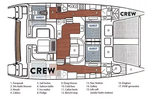KISMET accommodates up to six guests in three well-ventilated cabins—with queen-size beds. Each cabin features its own en-suite bathroom with shower, electric head, modern vanity, and plenty of natural light and airflow. Full air conditioning runs throughout the yacht for those still nights to cool things down before sleep, and an additional on-deck misting system adds a refreshing touch on warm tropical afternoons.