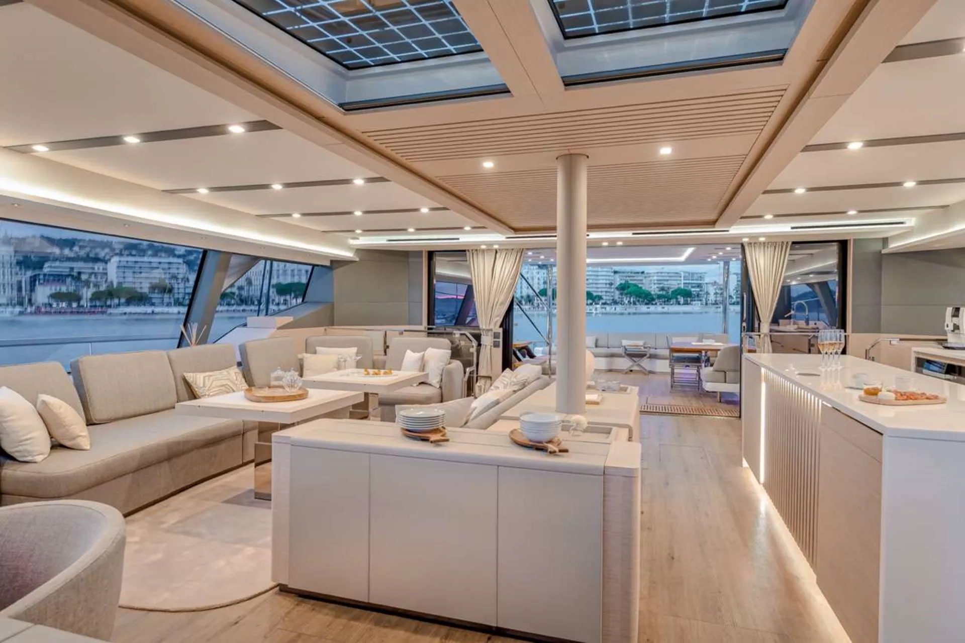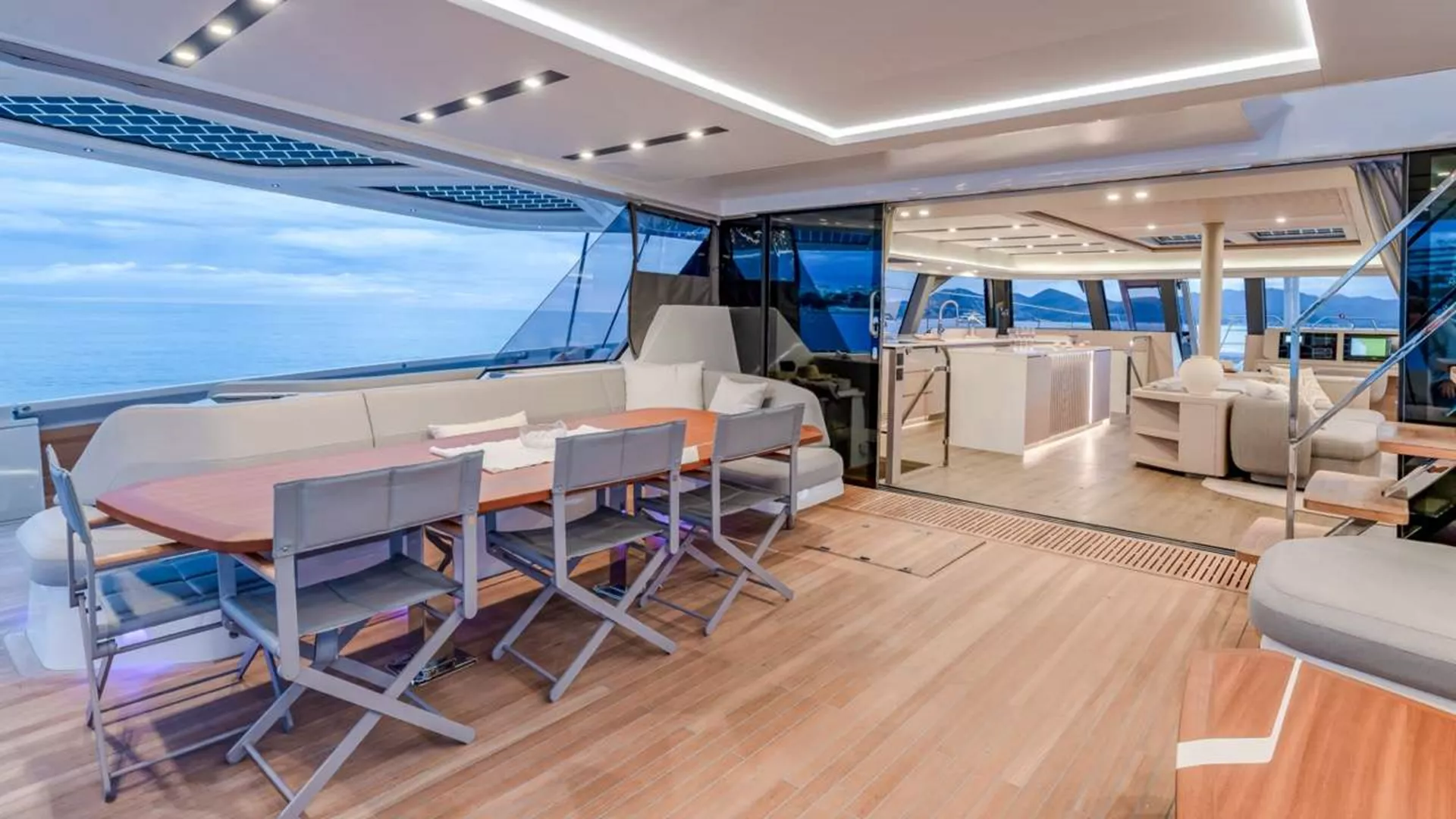 Typical to Fountaine Pajot they have a door that leads directly from the saloon to the foredeck and aft there are double doors which open to spill seamlessly onto the aft dining and lounging areas. Sofas frame the aft deck allowing for plenty of seating and lounging options away from the dining table. Port and Starboard are folding wings to create balconies opening up the dining area even wider.