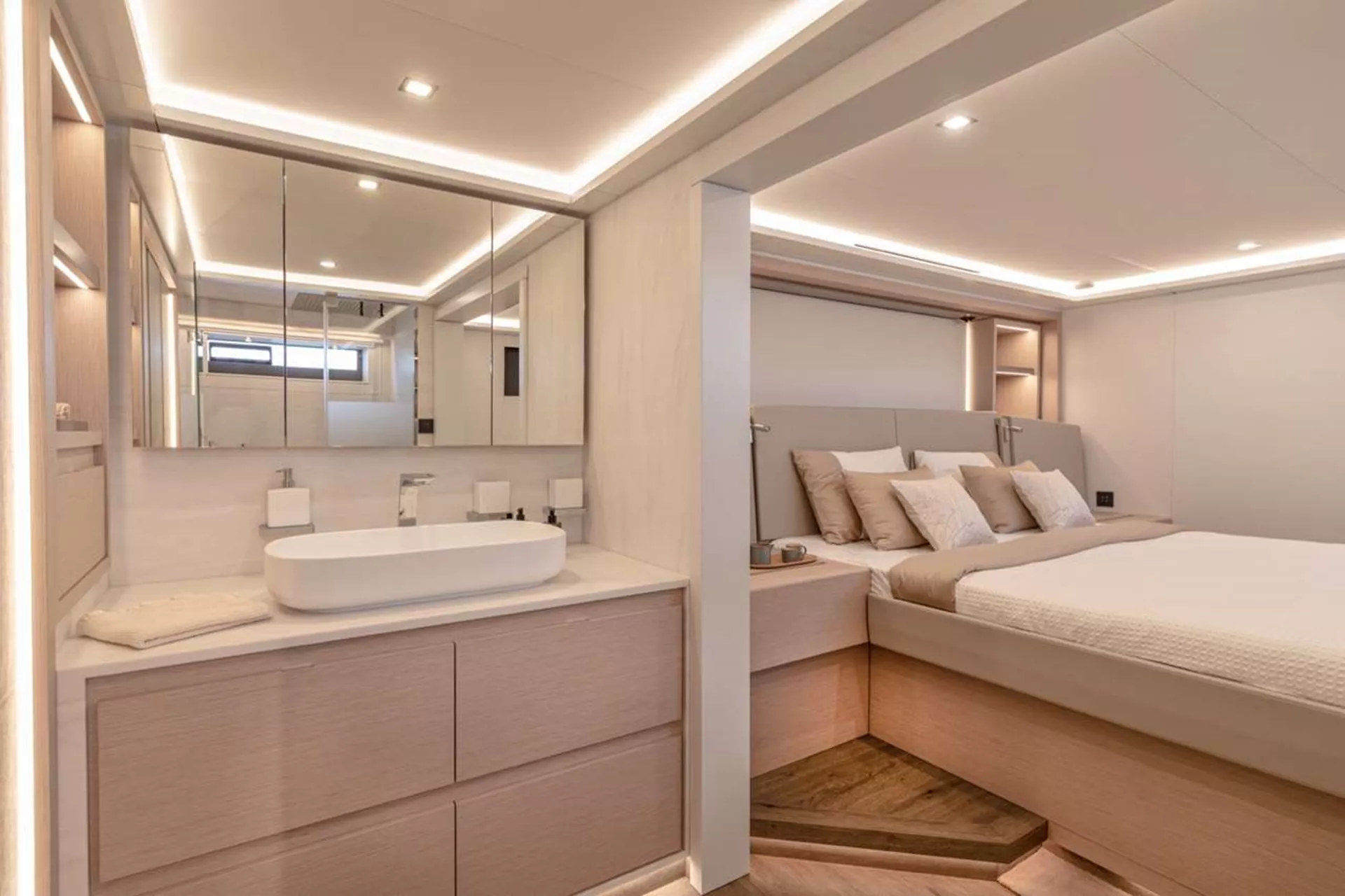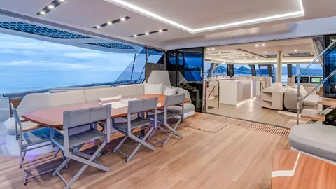The foredeck is the ultimate sun worshippers haven with vast, luxurious loungers in place of the nets typically seen on catamaran foredecks, also features sunken sofas and a deck jacuzzi!