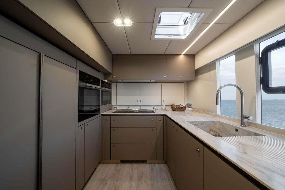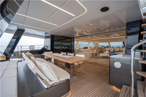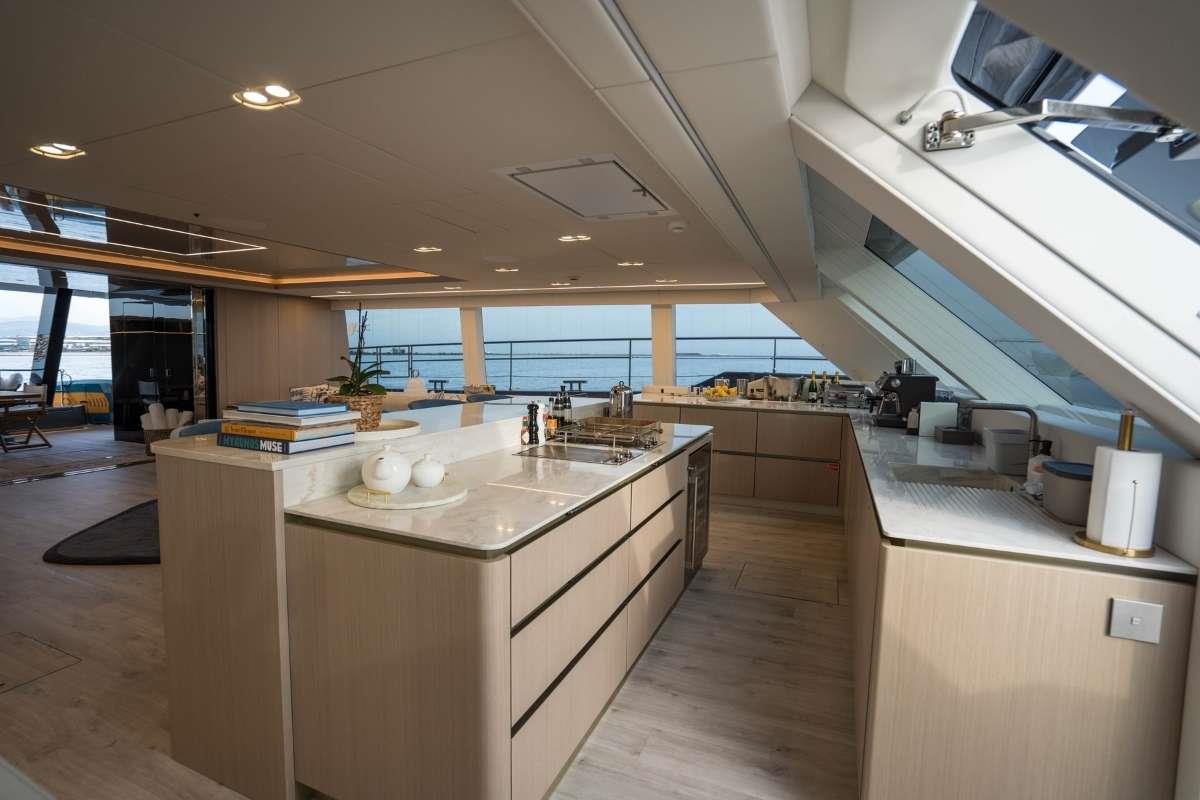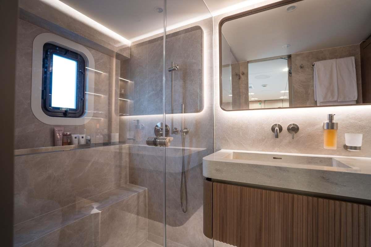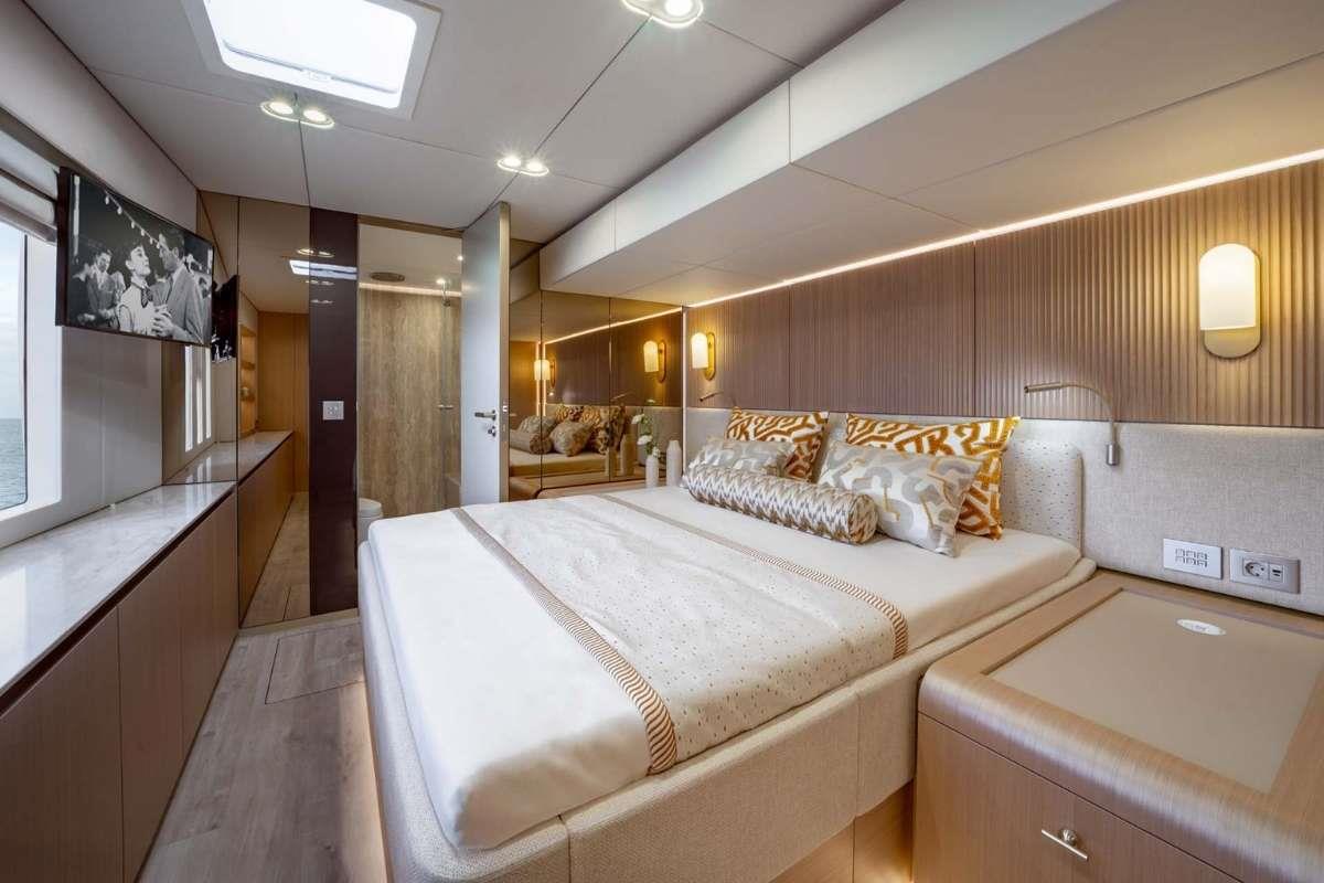 Her layout is made for relaxed charter living, with generous spaces for dining, sunbathing, entertaining, and unwinding throughout the day. Guests can enjoy open-air meals on the flybridge, slow afternoons in the deck jacuzzi, sunset drinks by the bar, or easy access to the sea from the swim platform.