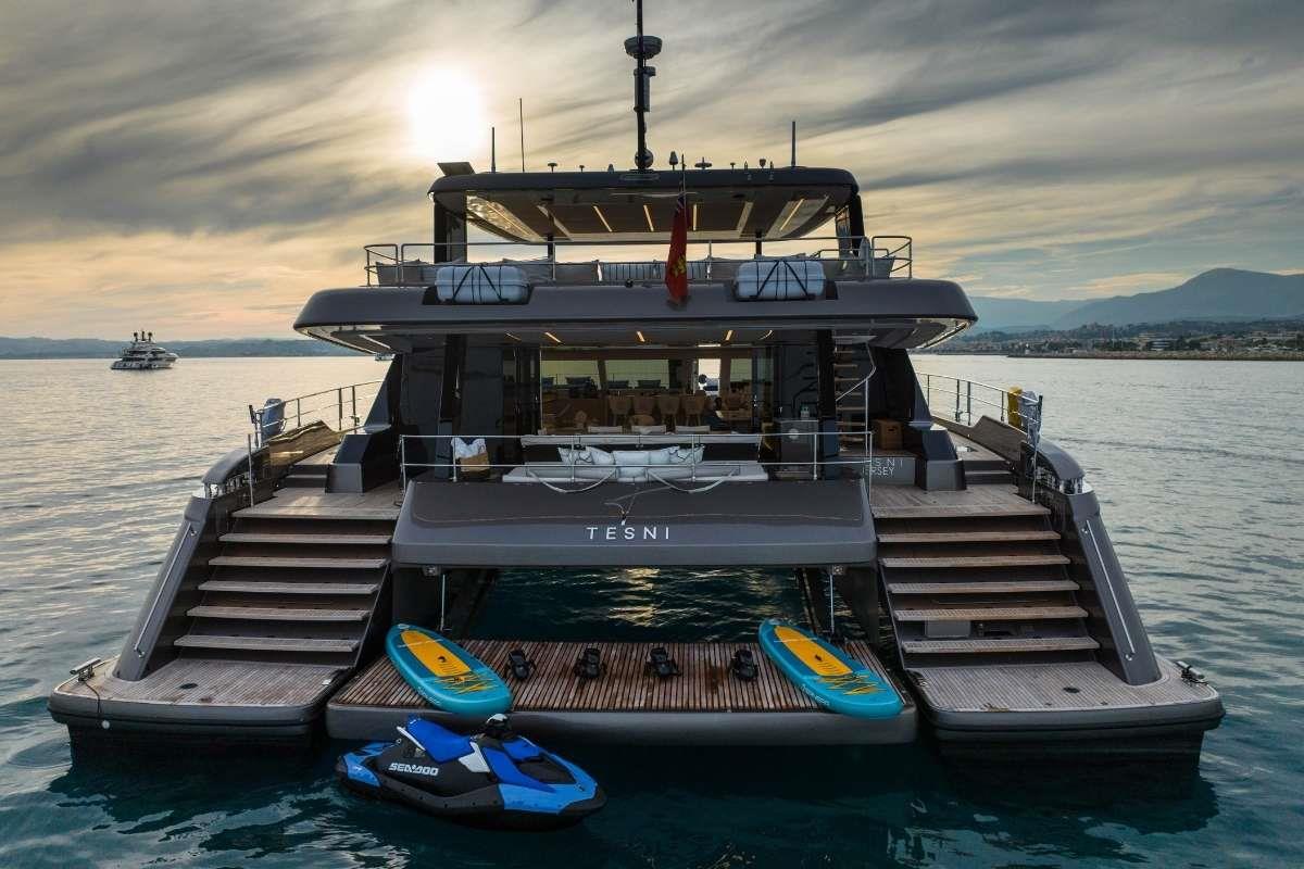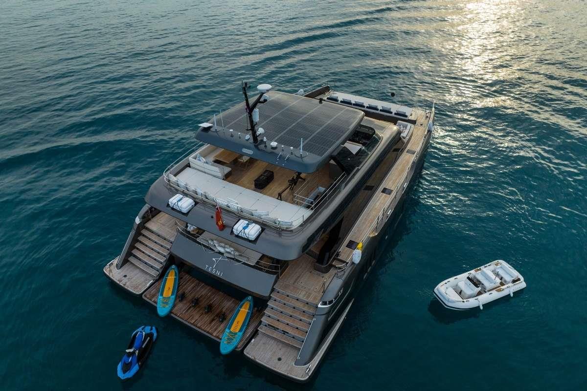 With her solar power integration, spacious flybridge, foredeck lounge, alfresco dining areas, deck jacuzzi, and wide selection of water activities, TESNI offers a modern luxury charter experience shaped around comfort, connection, and time on the water.