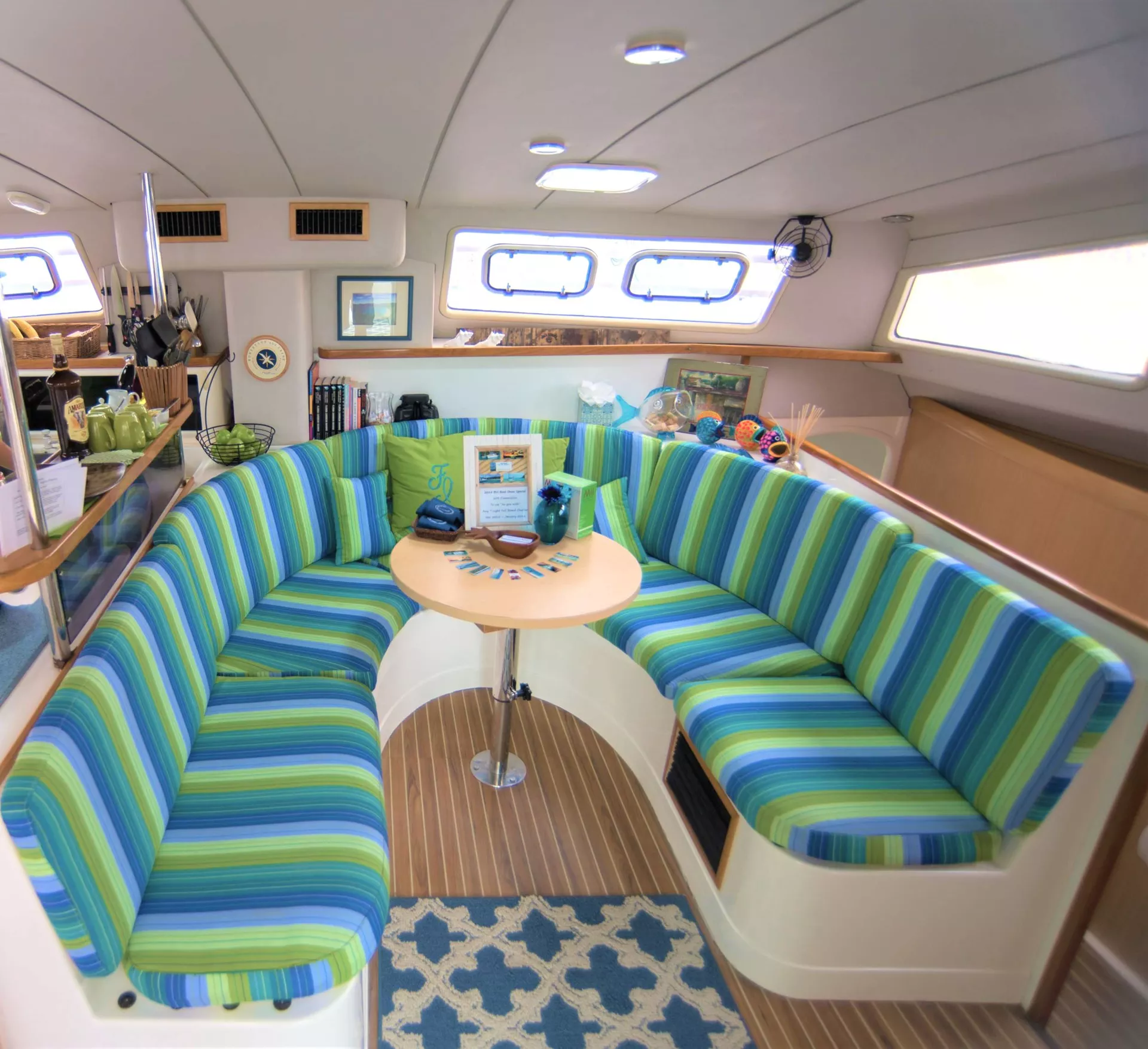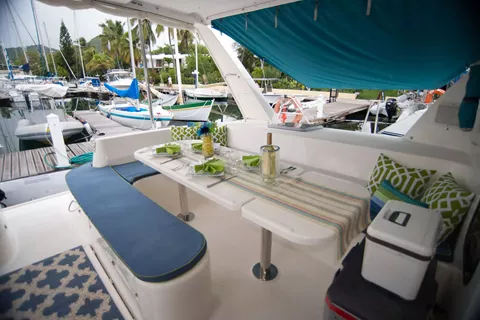 Spacious covered cockpit for dining and lounging plus large forward trampoline.