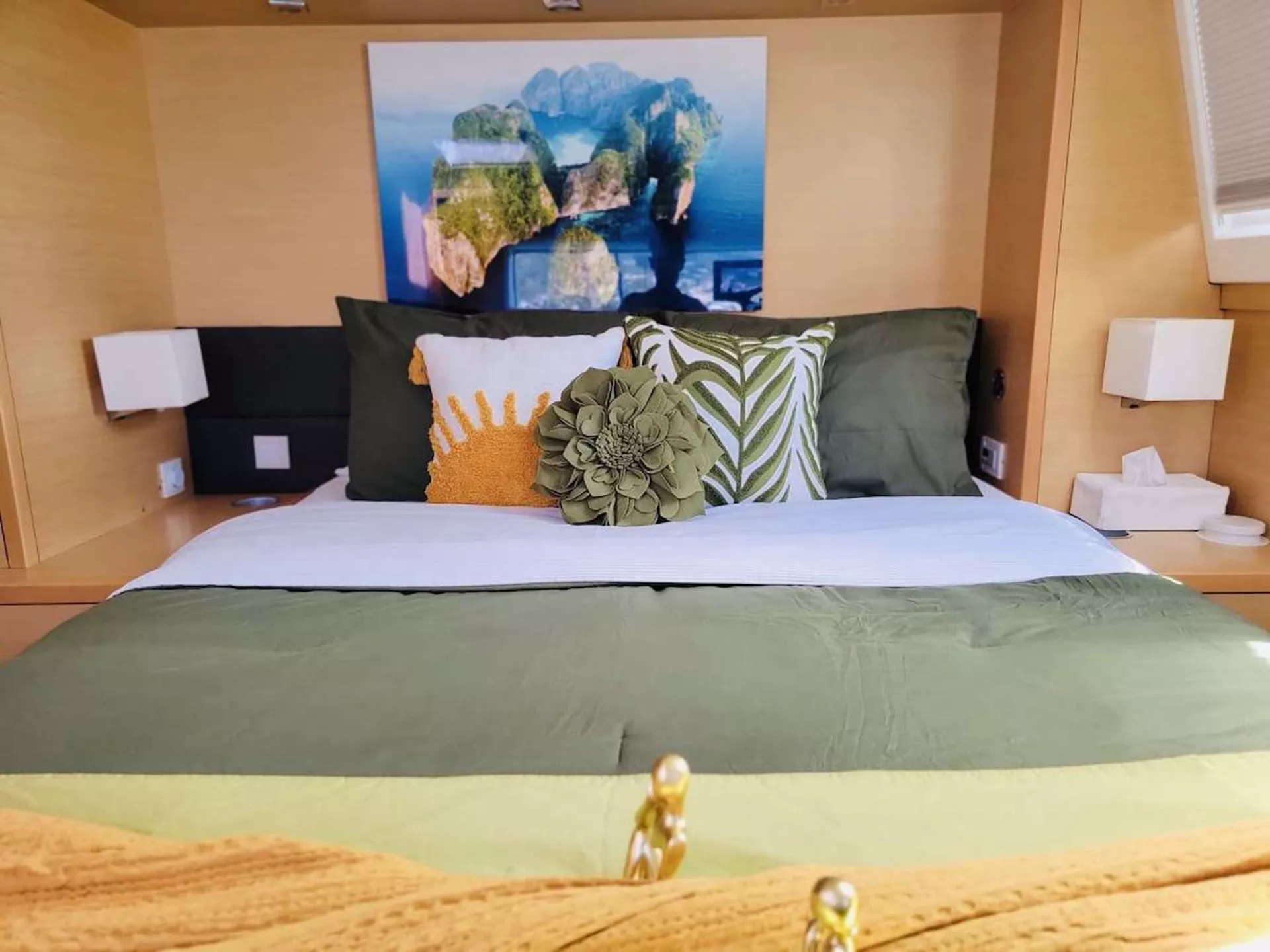 Yacht sleeps up to 8 guests in 4 queen cabins. The master cabin is a full suite with lounge and desk area, spacious bath with glass shower stall and direct access to aft deck. There are 3 queen cabins each with private ensuite electric head, shower and wash basin. Crew have twin bunks.