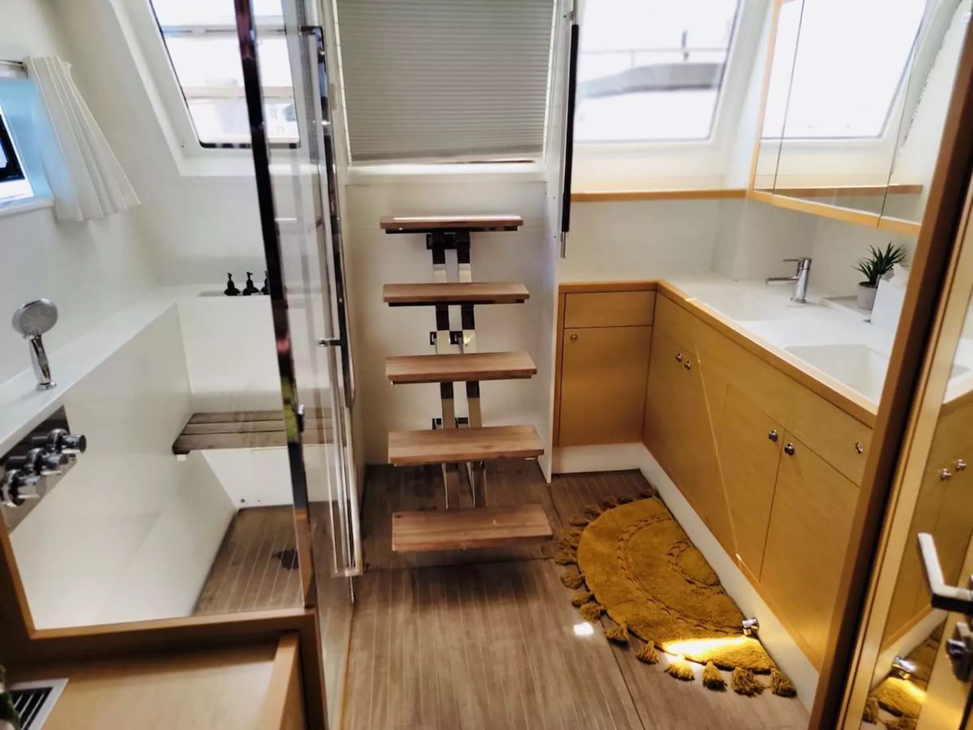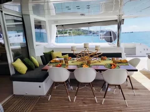 The design of the 620 has been perfected for socializing with seemingly endless space both above and below deck. This yacht shows why it is the gold standard as the setting for the perfect guest experience. With multiple dining, living, sunbathing, and lounge areas to choose from, you will always have the space to sneak away for some shade or to read a book.... or you can choose to get as involved as you desire. As a larger catamaran, you can count on greater comfort while at sea, and a second-to-none sailing performance during navigations. The salon is extremely spacious, thanks to well thought out style and intelligent design with large windows ensuring all are able to enjoy the beautiful scenery from the salon in 360 degrees. It features a U-shaped sofa and coffee table for lounging.