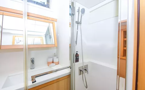 There are tremendous amounts of entertaining and relaxing space on board this vessel. The Flybridge: where the helm and sailing functions meet the enormous convertible settee- provide the best seat in the house whether under sail or under stars. The Forward Cockpit Lounge: where morning coffee meets the sunrise. The Aft Cockpit: where the exquisite meals are served and chaise lounges are spread throughout the yacht. The Main Salon: which houses the open-concept galley, large sofa-chaise and flat-screen TV. And also a more formal dining area should that be desired.