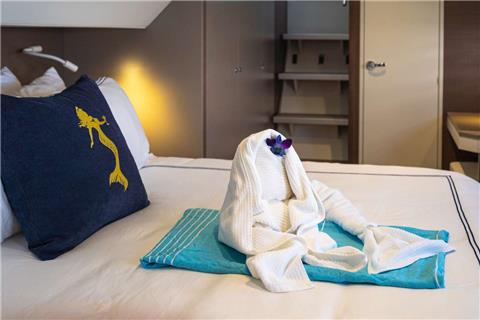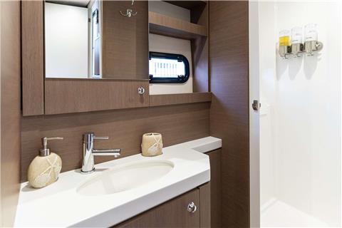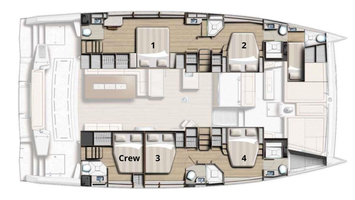 Big Nauti will accommodate 8 charter guests in 4 luxurious queen cabins each with ensuite bathrooms and separate showers. The forward cabins and the starboard midships cabin are dramatic queen berths that give the illusion of floating in space with views of the beautiful Caribbean waters from the comfort of your bed. The port aft large master cabin is spacious offering ample moving room and storage. It has private access from the deck as well as from the saloon and features a separate shower and vanity areas.