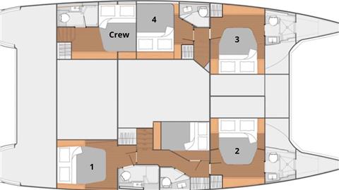 This yacht has 4 ensuite cabins accommodating 8 guests.