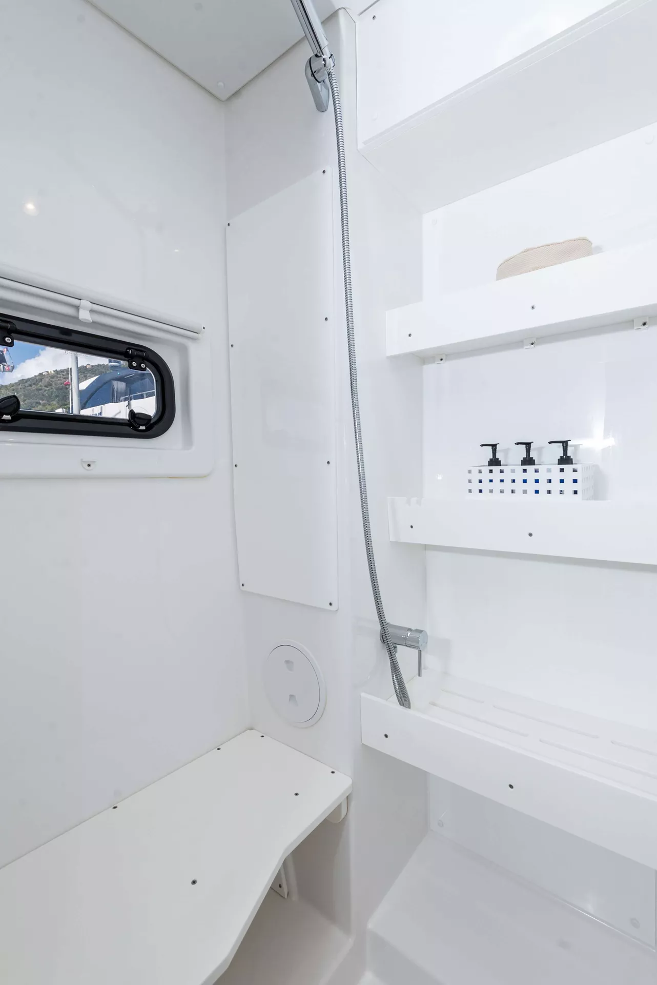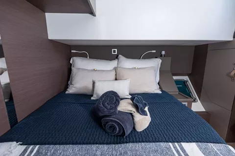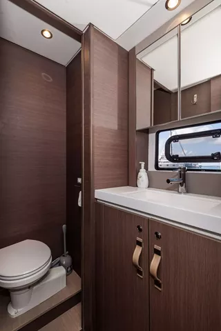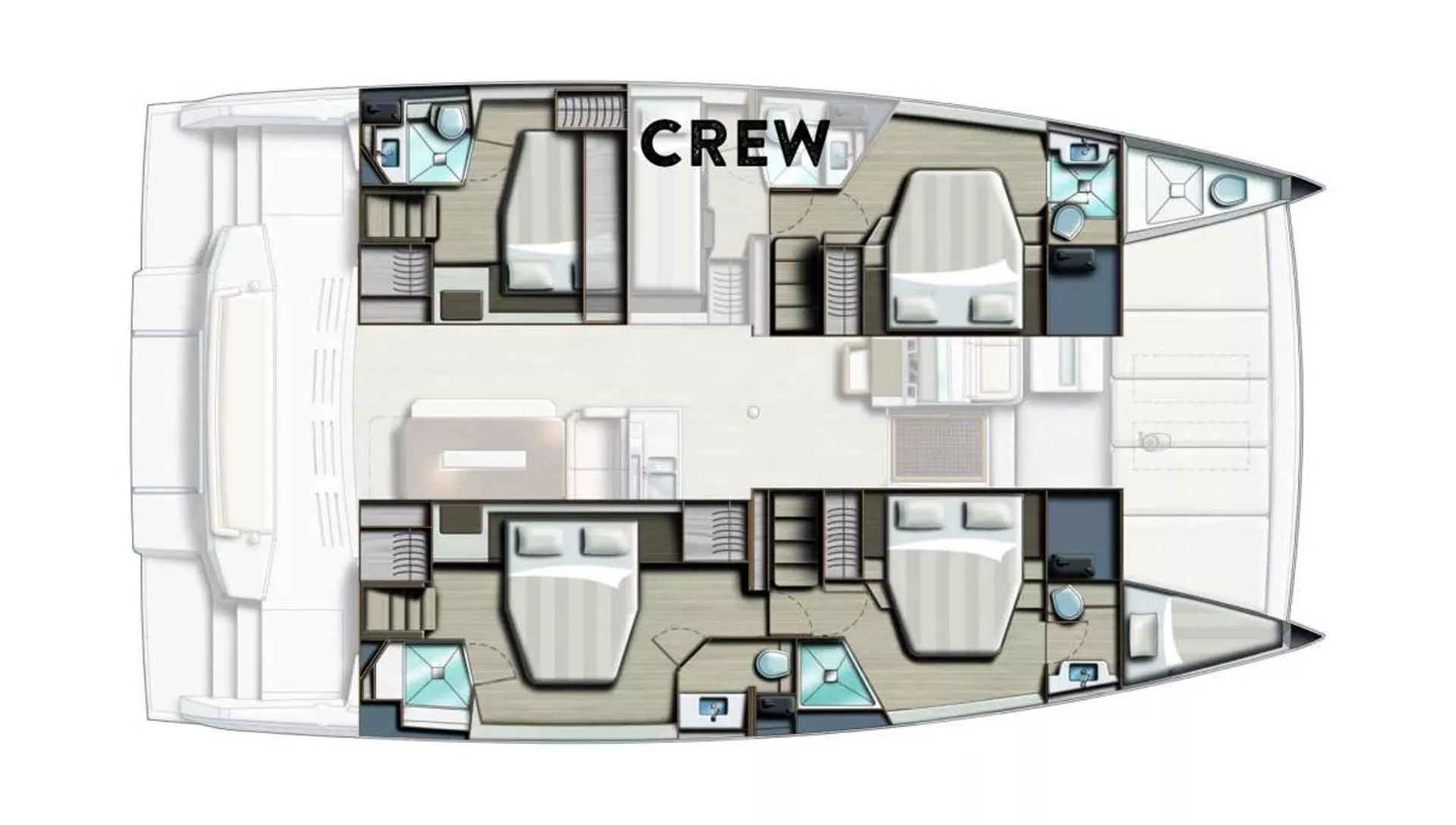 4 queen berth guest cabins each with a private en-suite electric head, shower and sink/vanity. Starboard side heads have dry stall showers, port side heads have wet showers.