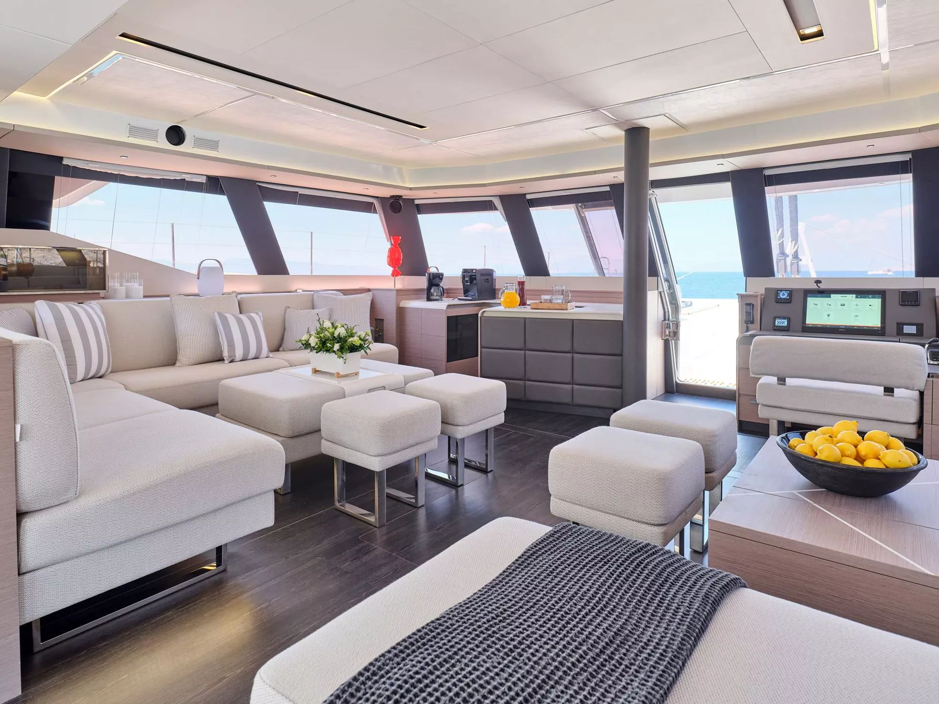 Her impressive flybridge is one of the yacht’s signature features — a vast open-air lounge with panoramic 360° views and two large sunbathing beds aft, creating the perfect atmosphere for relaxing afternoons or sunset cocktails. On the main deck, guests can enjoy multiple areas for relaxation and socializing. The foredeck features a comfortable lounge area centered around a Jacuzzi, ideal for unwinding with a view of the horizon. Aft, the cockpit serves as the social hub of the yacht, offering a large dining table for up to 8 guests, generous seating, and seamless access to the sea via the hydraulic bathing platform — perfect for swimming, launching water toys, or even morning yoga sessions over the water.