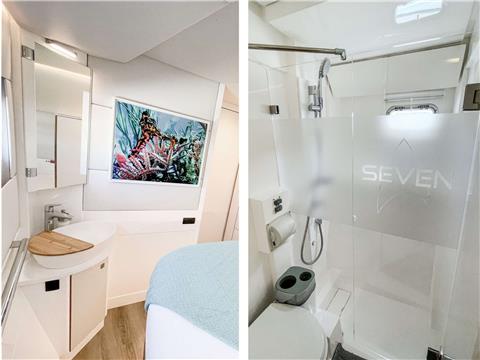 Cabins feature ample storage with drawers, lockers, and space under the bed for soft luggage. Each cabin is decorated in shades of Caribbean blue and feature underwater photography taken by SEVEN’s owner.