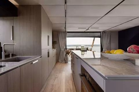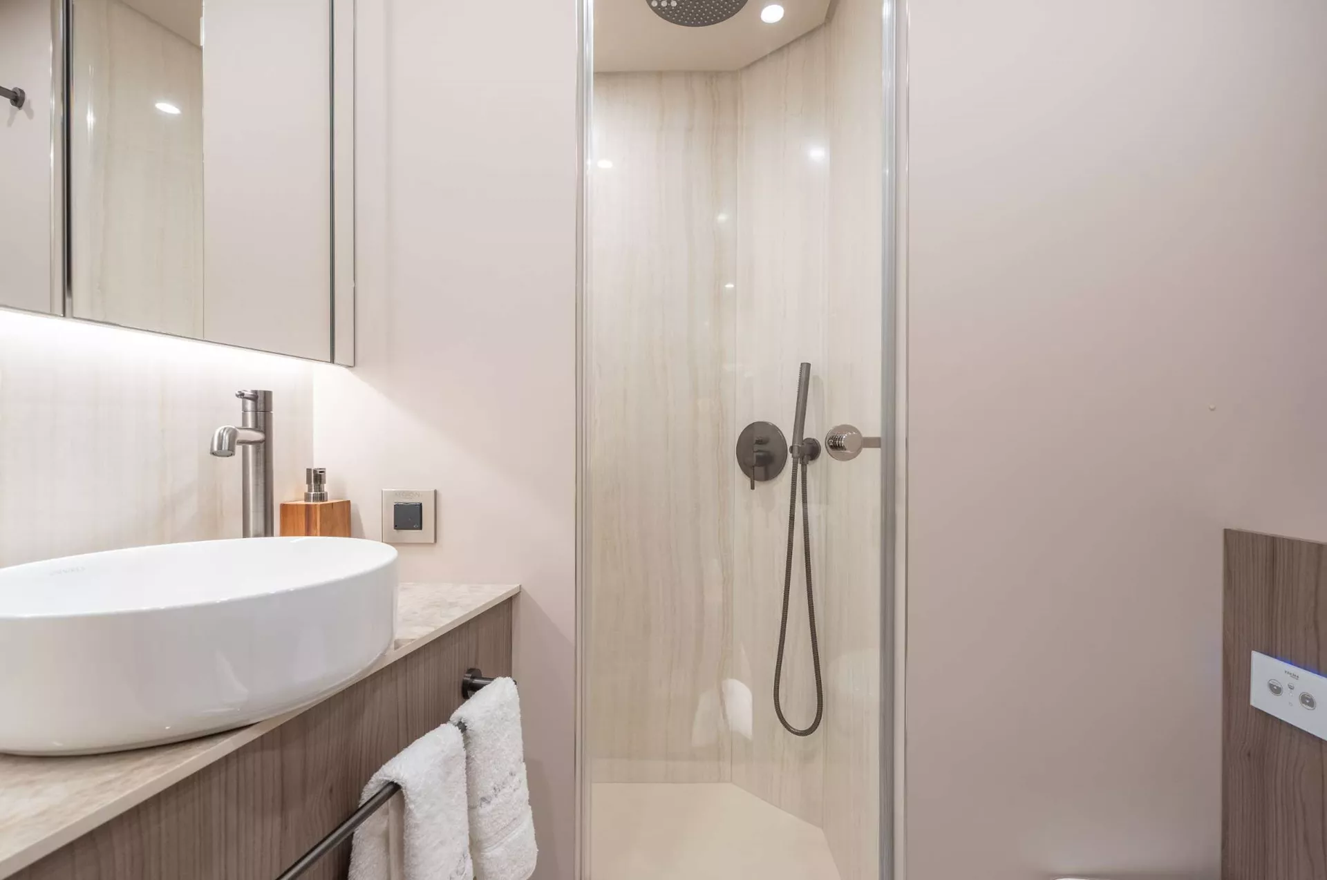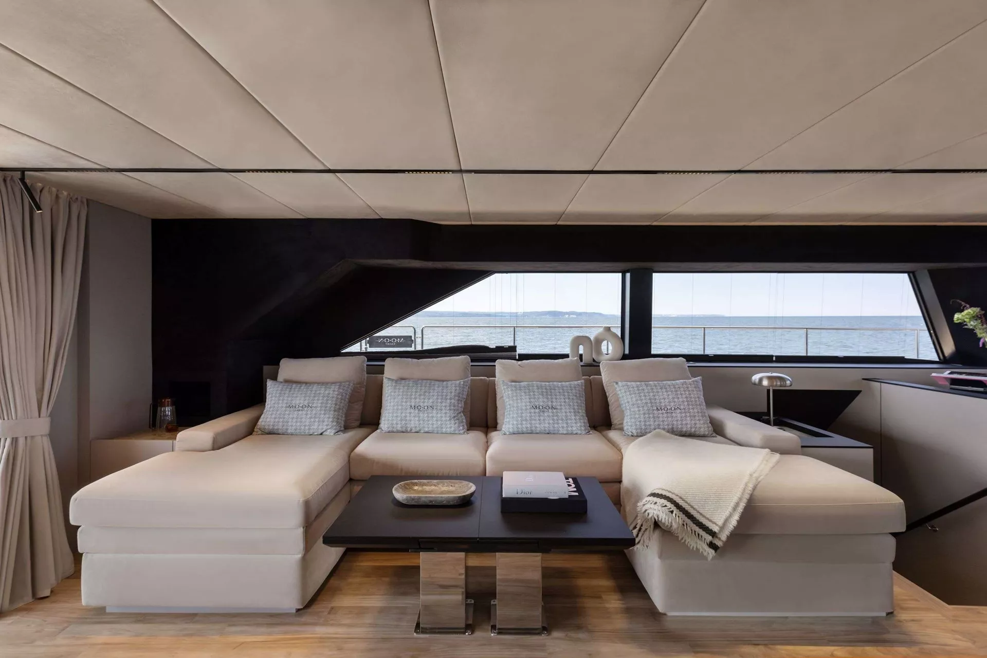 The interior of the MOON 6ty is a true feast for the senses—spacious, modern, and fully tailored to the owner's individual preferences. The selection of materials, including natural stone, sintered surfaces, and elegant upholstery, ensures that every part of the yacht forms a cohesive, luxurious whole. Thoughtful spatial arrangement, with attention to every detail, makes the MOON 6ty the perfect space for top-tier relaxation, where each element is unique and designed with passion.
