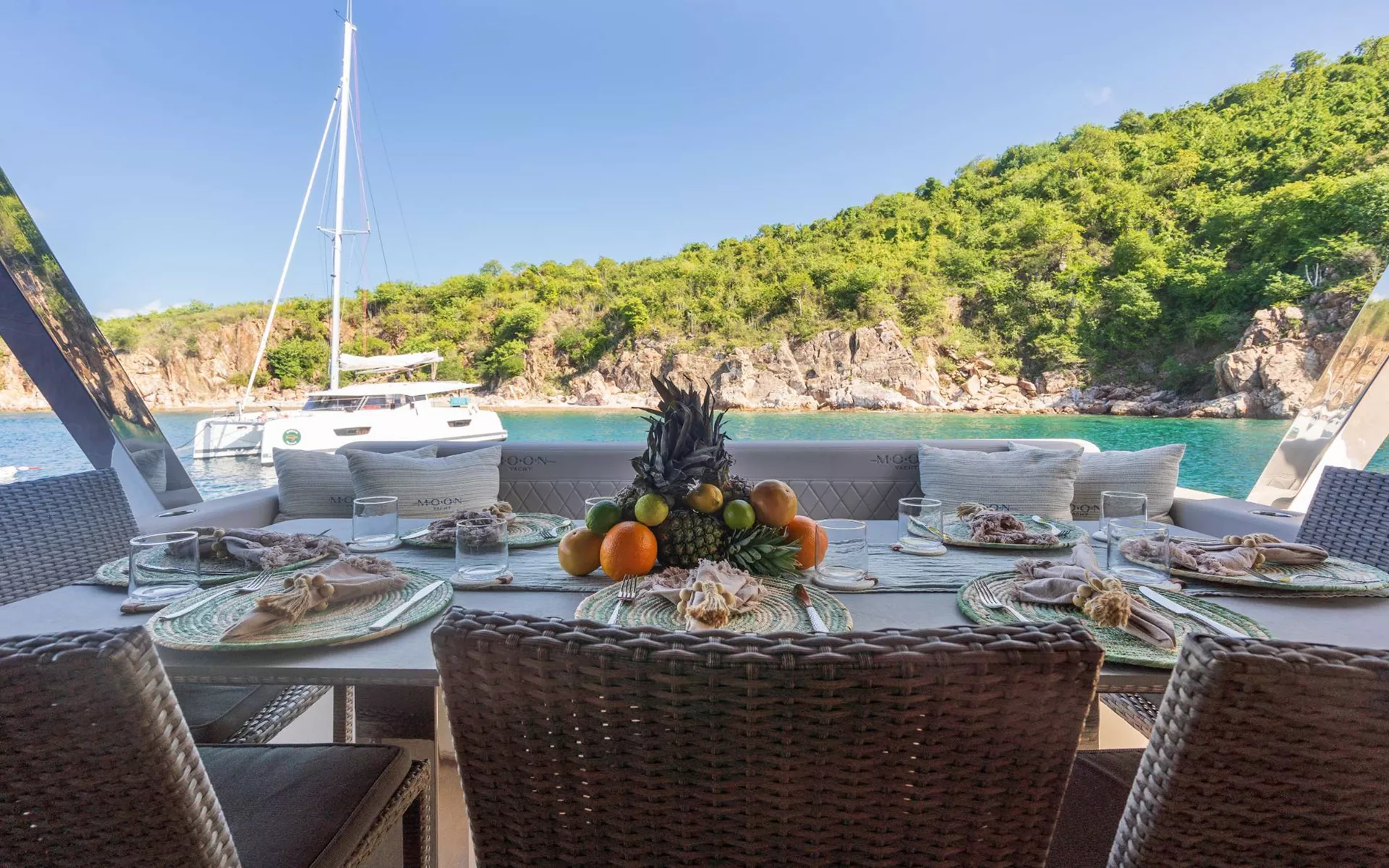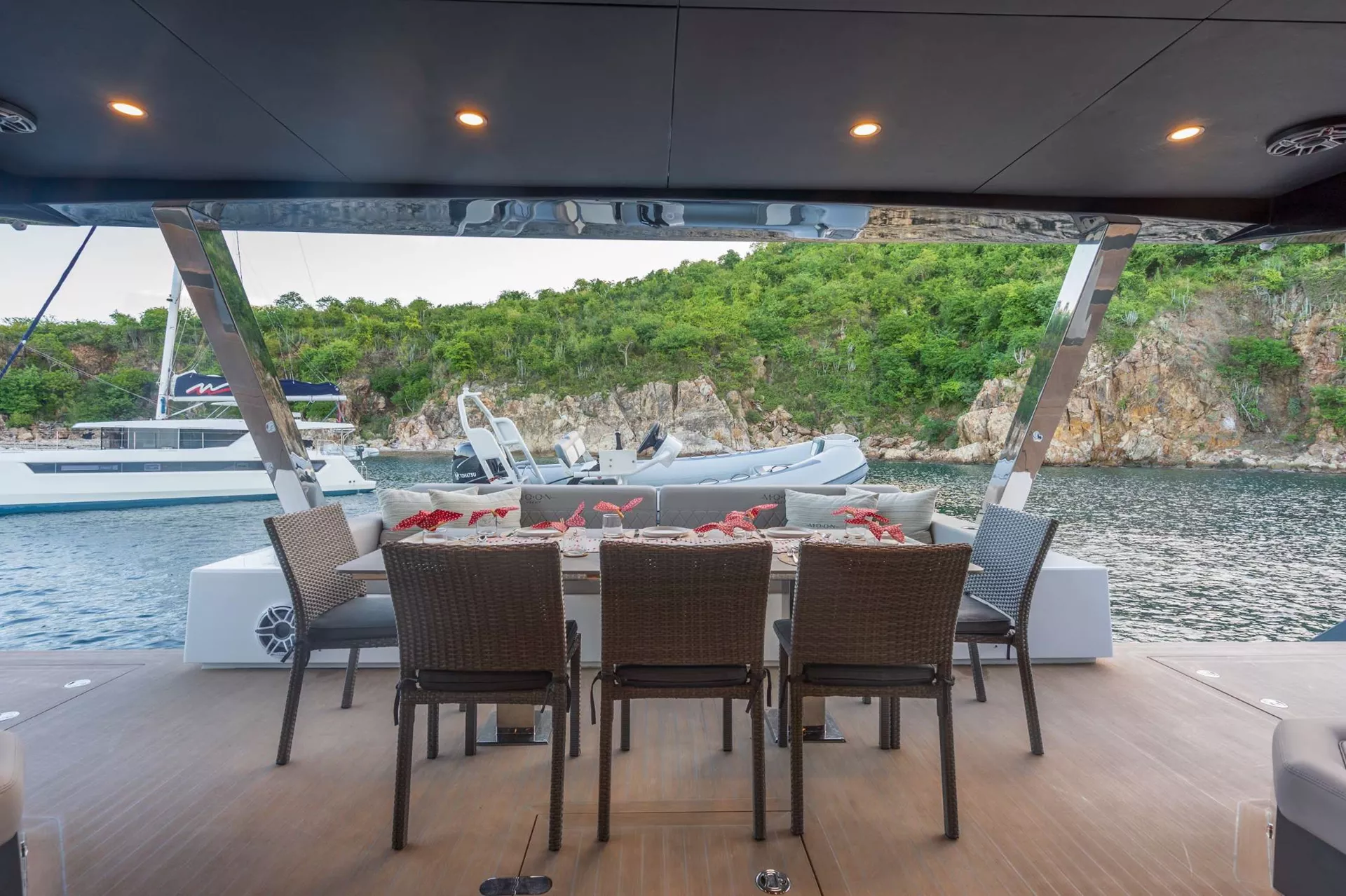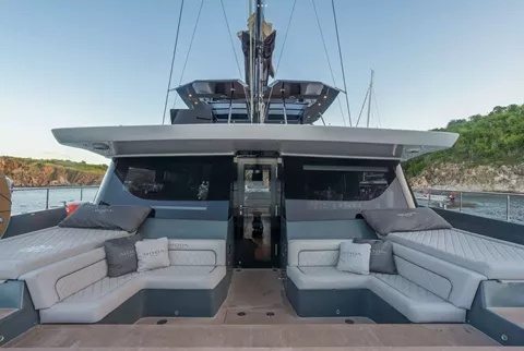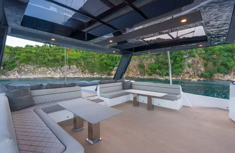 Aft Cockpit: A shaded outdoor lounge ideal for long, leisurely lunches, sunset cocktails, or watching the action in the water.