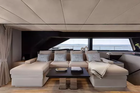 Main Salon: A bright, open-plan interior with panoramic views, sophisticated décor, and plush seating—perfect for relaxing or enjoying a movie.