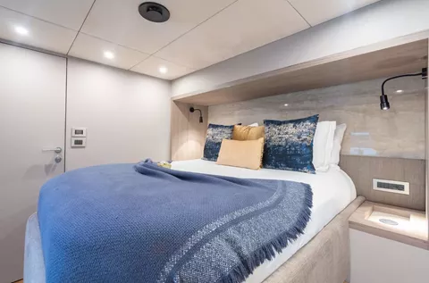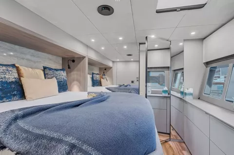 Choose from 5 elegantly appointed guest cabins, each with a plush queen-size bed, ample storage, and private ensuite bathroom. And 1 single forepeak with private bathroom. The cabins are flooded with natural light through oversized windows, creating a peaceful, airy atmosphere. Perfect for couples, friends, or families traveling together, the layout ensures every guest has a tranquil retreat of their own.