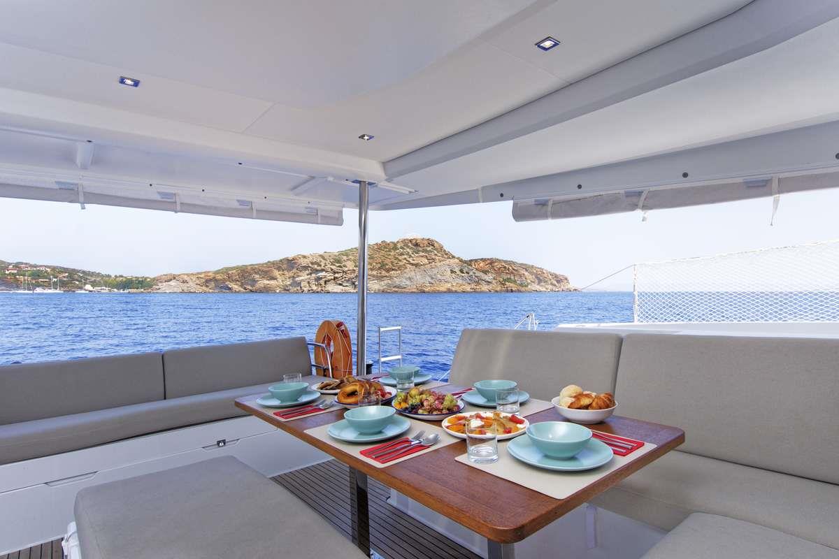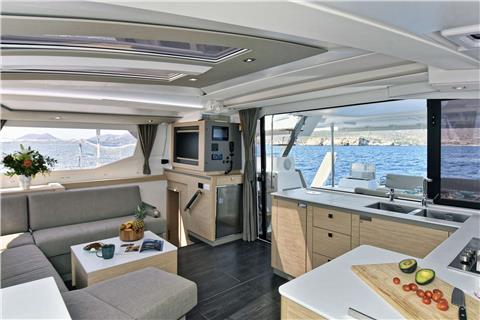 Step aboard the Tanna 47, a luxurious yacht with a dedicated permanent crew, offering an unparalleled sailing experience. The yacht features a thoughtfully designed U-shaped galley, complemented by a spacious opening bay door, creating a sense of expansive living with abundant natural light that highlights its elegant interior.
