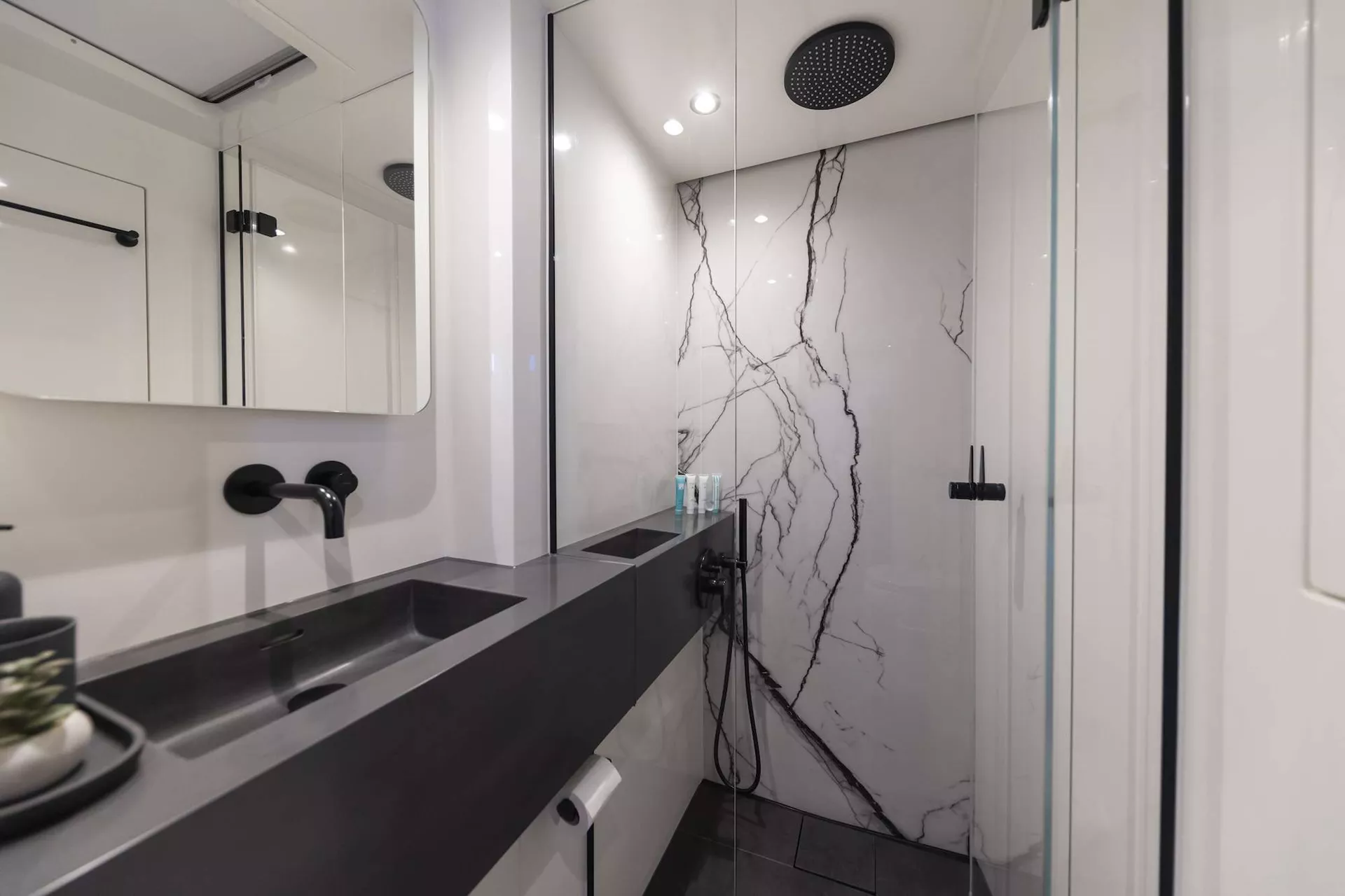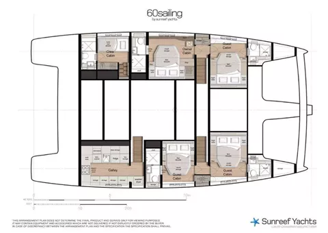 The layout includes 4 spacious guest cabins, each fitted with a queen-size bed and a private en suite bathroom.