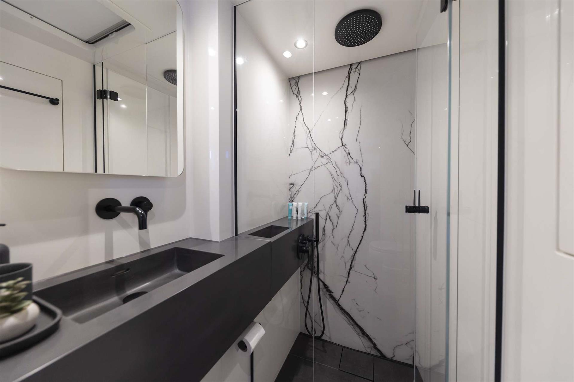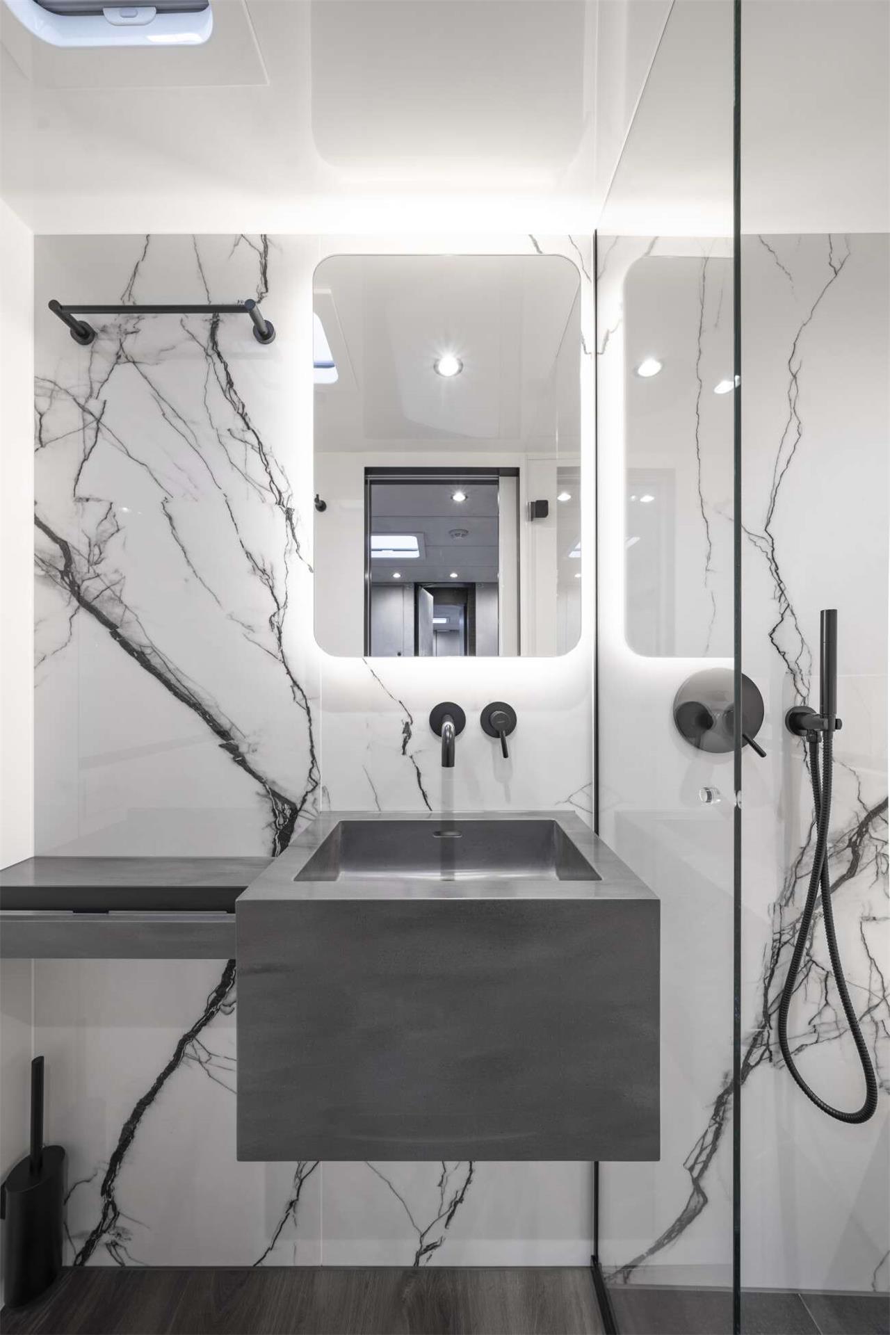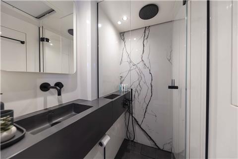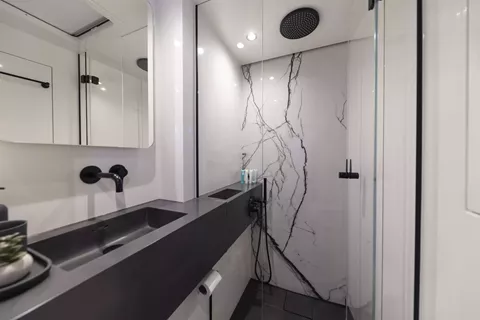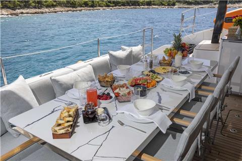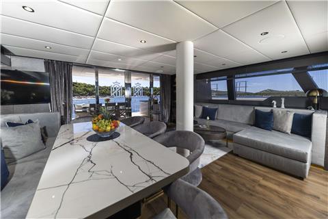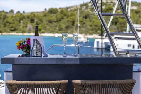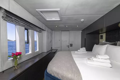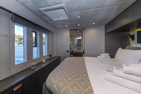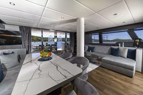 Mr Si is a Sunreef 60 launched in 2023, offering a refined and contemporary look throughout. Designed with comfort and space in mind, the yacht features large panoramic windows in the saloon, filling the interior with natural light and allowing for beautiful sea views. Both sides of the main living area open up with sliding glass doors, creating a seamless indoor-outdoor experience.